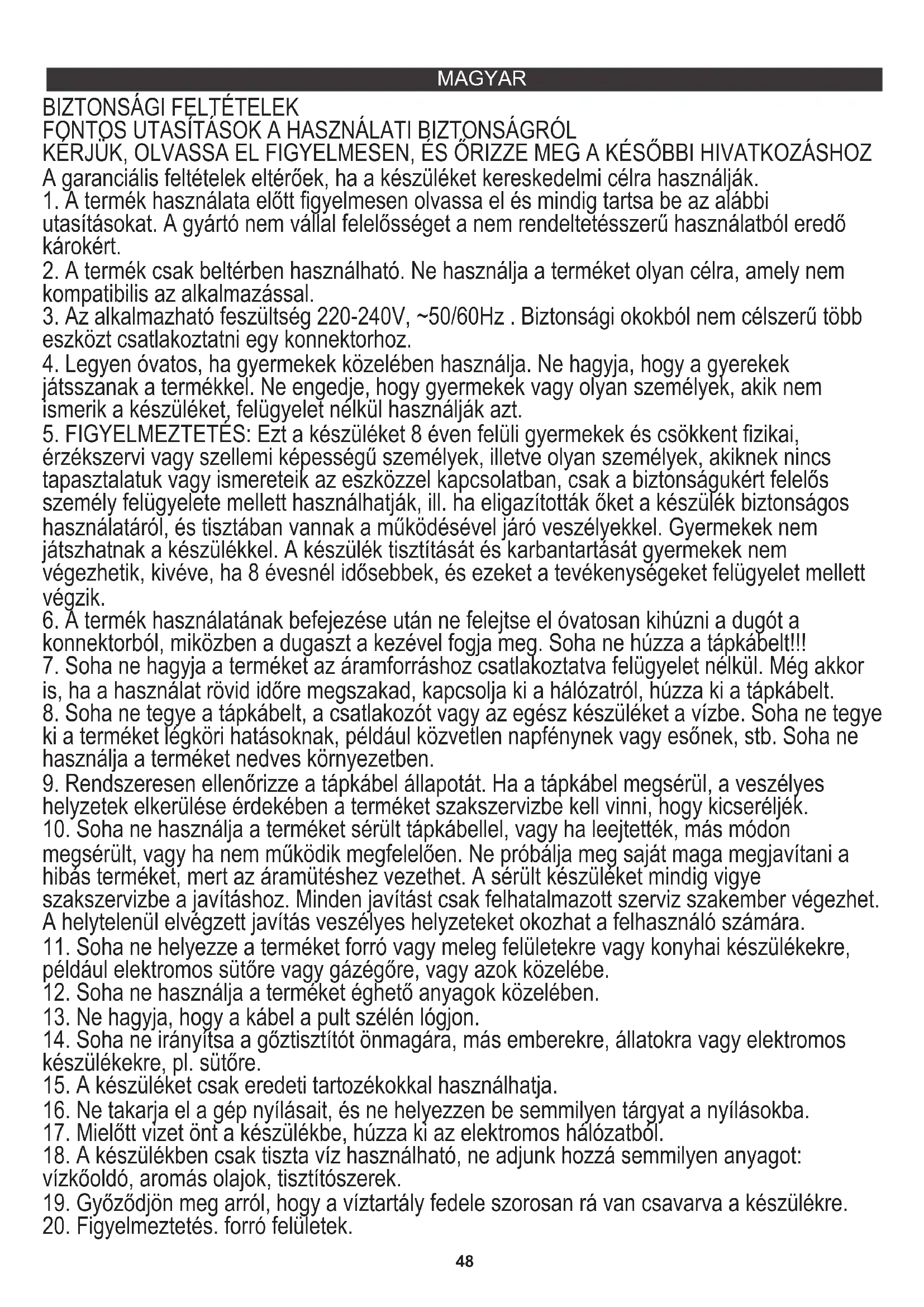 FONTOS UTASÍTÁSOK A HASZNÁLATI BIZTONSÁGRÓL KÉRJÜK, OLVASSA EL FIGYELMESEN, ÉS ŐRIZZE MEG A KÉSŐBBI HIVATKOZÁSHOZ A garanciális feltételek eltérőek, ha a készüléket kereskedelmi célra használják.