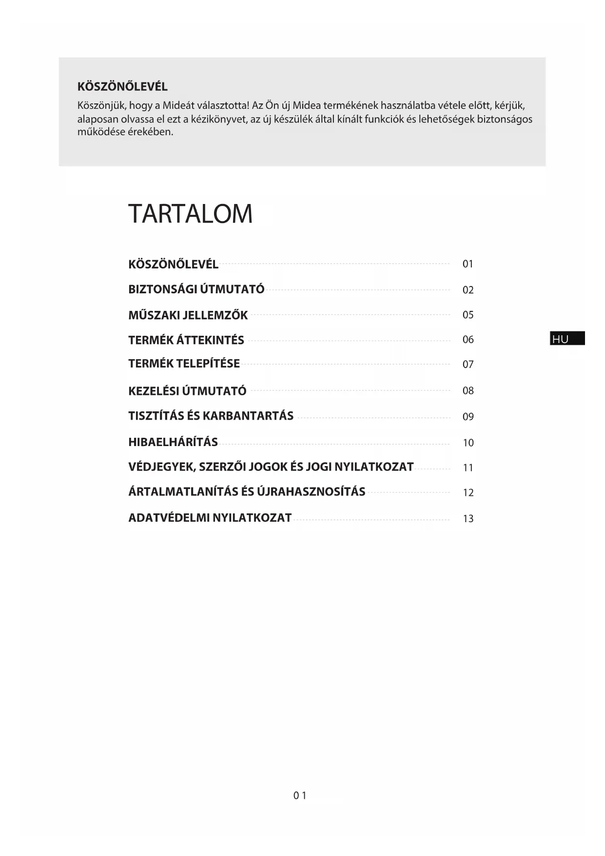 Köszönjük, hogy a Mideát választotta! Az Ön új Midea termékének használatba vétele előtt, kérjük, alaposan olvassa el ezt a kézikönyvet, az új készülék által kínált funkciók és lehetőségek biztonságos működése érekében. TARTALOM