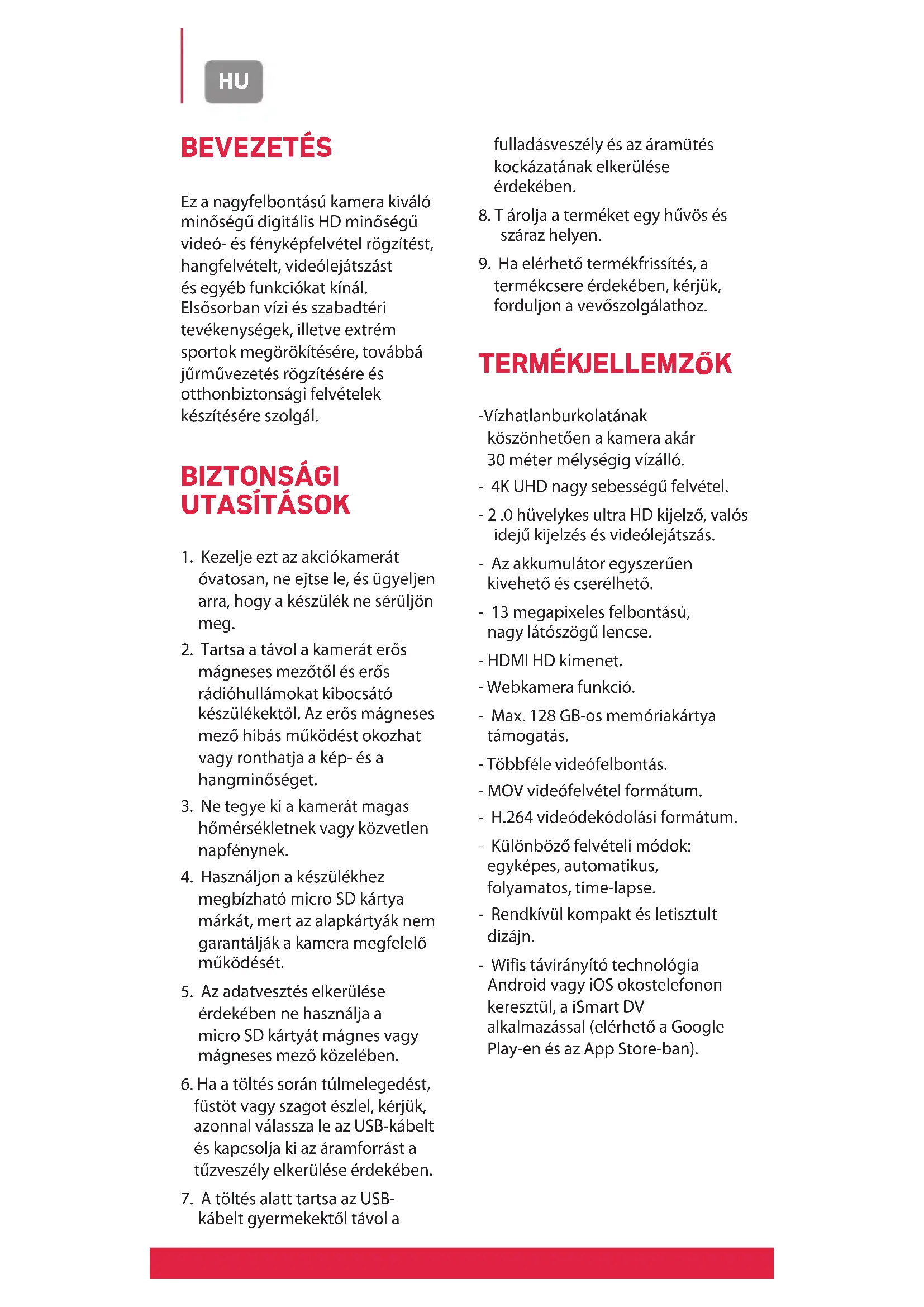 conexão Wi-Fi Em primeiro lugar, certifique-se que a conexao Wi-Fi da câmara está corretamente ativada, em seguida que comprove que escolheu o nome Wi-Fi correto e de que introduziu a password associada nas configurações do seu smartphone/tablet para permitir a conexão. Se isto não funcionar, verifique que a versão da aplicação é a mais recente e atualize-a se necessário.HU BEVEZETÉS Ez a nagyfelbontású kamera kiváló minőségű digitális HD minőségű videó- és fényképfelvétel rögzítést, hangfelvételt, videólejátszást és egyéb funkciókat kínál. Elsősorban vízi és szabadtéri tevékenységek, illetve extrém sportok megörökítésére, továbbá jűrművezetés rögzítésére és otthonbiztonsági felvételek készítésére szolgál. BIZTONSÁGI