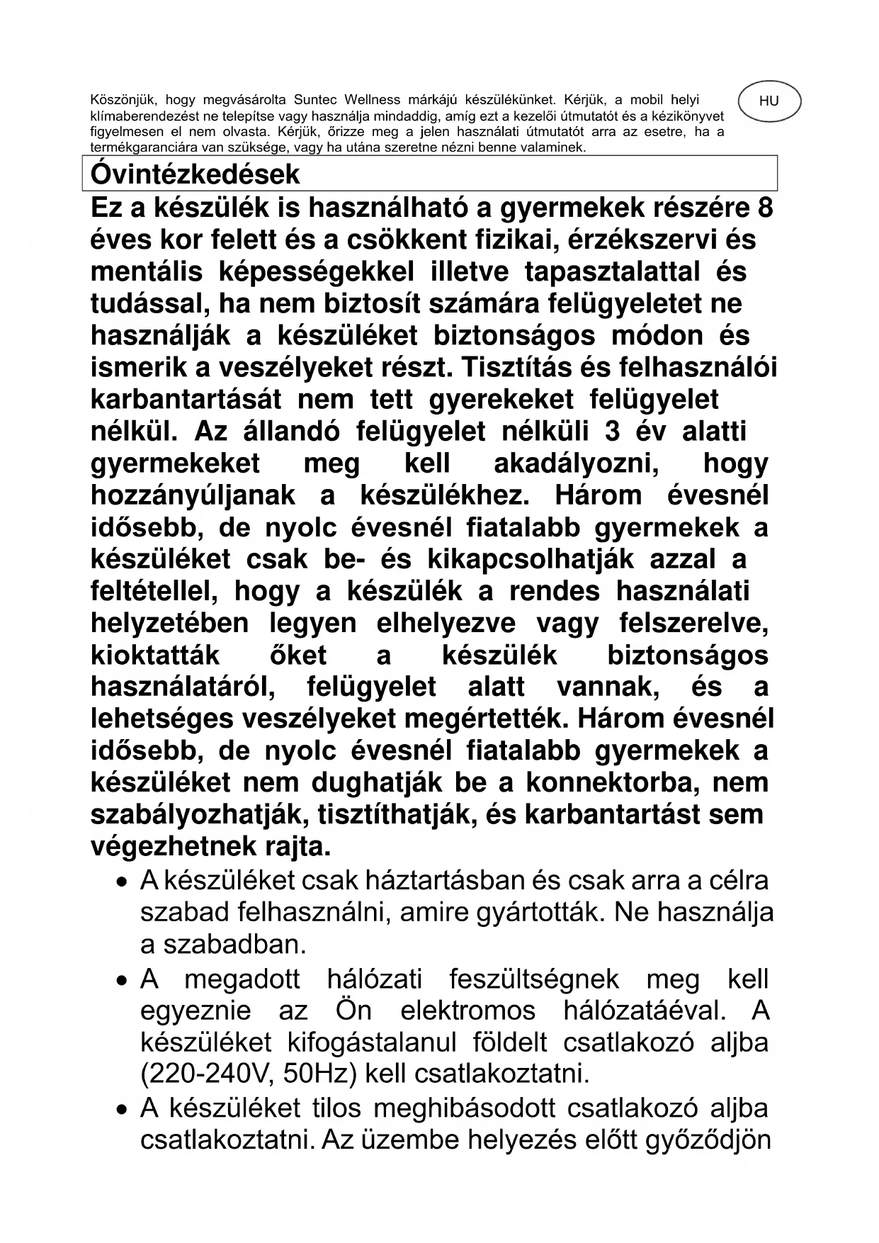 © 2023 KLIMATRONIC® Coolfixx/Advance 12000/14000 BTU App SUNTEC WELLNESS GMBH / HOLZSTRASSE 2 / 40 221 DÜSSELDORF / GERMANYKöszönjük, hogy megvásárolta Suntec Wellness márkájú készülékünket. Kérjük, a mobil helyi klímaberendezést ne telepítse vagy használja mindaddig, amíg ezt a kezelői útmutatót és a kézikönyvet figyelmesen el nem olvasta. Kérjük, őrizze meg a jelen használati útmutatót arra az esetre, ha a termékgaranciára van szüksége, vagy ha utána szeretne nézni benne valaminek. Óvintézkedések Ez a készülék is használható a gyermekek részére 8 éves kor felett és a csökkent fizikai, érzékszervi és mentális képességekkel illetve tapasztalattal és tudással, ha nem biztosít számára felügyeletet ne használják a készüléket biztonságos módon és ismerik a veszélyeket részt. Tisztítás és felhasználói karbantartását nem tett gyerekeket felügyelet nélkül. Az állandó felügyelet nélküli 3 év alatti gyermekeket meg kell akadályozni, hogy hozzányúljanak a készülékhez. Három évesnél idősebb, de nyolc évesnél fiatalabb gyermekek a készüléket csak be- és kikapcsolhatják azzal a feltétellel, hogy a készülék a rendes használati helyzetében legyen elhelyezve vagy felszerelve, kioktatták őket a készülék biztonságos használatáról, felügyelet alatt vannak, és a lehetséges veszélyeket megértették. Három évesnél idősebb, de nyolc évesnél fiatalabb gyermekek a készüléket nem dughatják be a konnektorba, nem szabályozhatják, tisztíthatják, és karbantartást sem végezhetnek rajta.