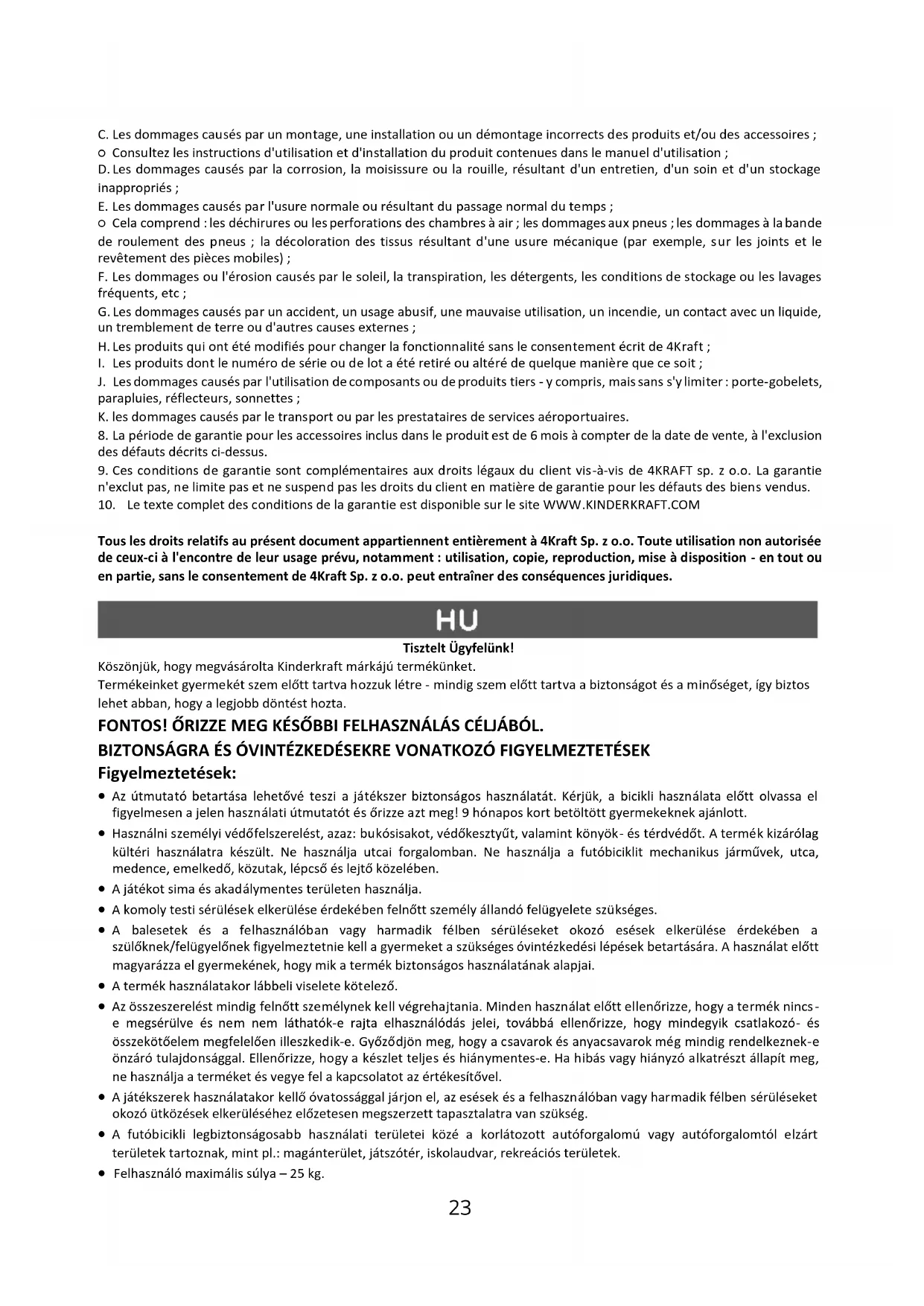 Tous les droits relatifs au présent document appartiennent entièrement à 4Kraft Sp. z o.o. Toute utilisation non autorisée de ceux-ci à l'encontre de leur usage prévu, notamment : utilisation, copie, reproduction, mise à disposition - en tout ou en partie, sans le consentement de 4Kraft Sp. z o.o. peut entraîner des conséquences juridiques. Tisztelt Ügyfelünk! Köszönjük, hogy megvásárolta Kinderkraft márkájú termékünket. Termékeinket gyermekét szem előtt tartva hozzuk létre - mindig szem előtt tartva a biztonságot és a minőséget, így biztos lehet abban, hogy a legjobb döntést hozta. FONTOS! ŐRIZZE MEG KÉSŐBBI FELHASZNÁLÁS CÉLJÁBÓL. BIZTONSÁGRA ÉS ÓVINTÉZKEDÉSEKRE VONATKOZÓ FIGYELMEZTETÉSEK Figyelmeztetések: