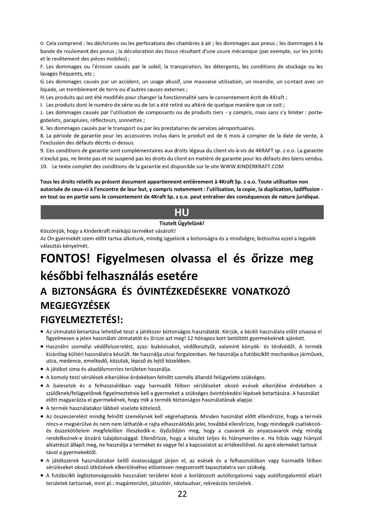 Tous les droits relatifs au présent document appartiennent entièrement à 4Kraft Sp. z o.o. Toute utilisation non autorisée de ceux-ci à l'encontre de leur but, y compris notamment : l'utilisation, la copie, la duplication, ladiffusion - en tout ou en partie sans le consentement de 4Kraft Sp. z o.o. peut entraîner des conséquences de nature juridique. Tisztelt Ügyfelünk! Köszönjük, hogy a Kinderkraft márkájú terméket vásárolt! Az Ön gyermekét szem előtt tartva alkotunk, mindig ügyelünk a biztonságra és a minőségre, biztosítva ezzel a legjobb választás kényelmét. FONTOS! Figyelmesen olvassa el és őrizze meg későbbi felhasználás esetére A BIZTONSÁGRA ÉS ÓVINTÉZKEDÉSEKRE VONATKOZÓ MEGJEGYZÉSEK FIGYELMEZTETÉS!: