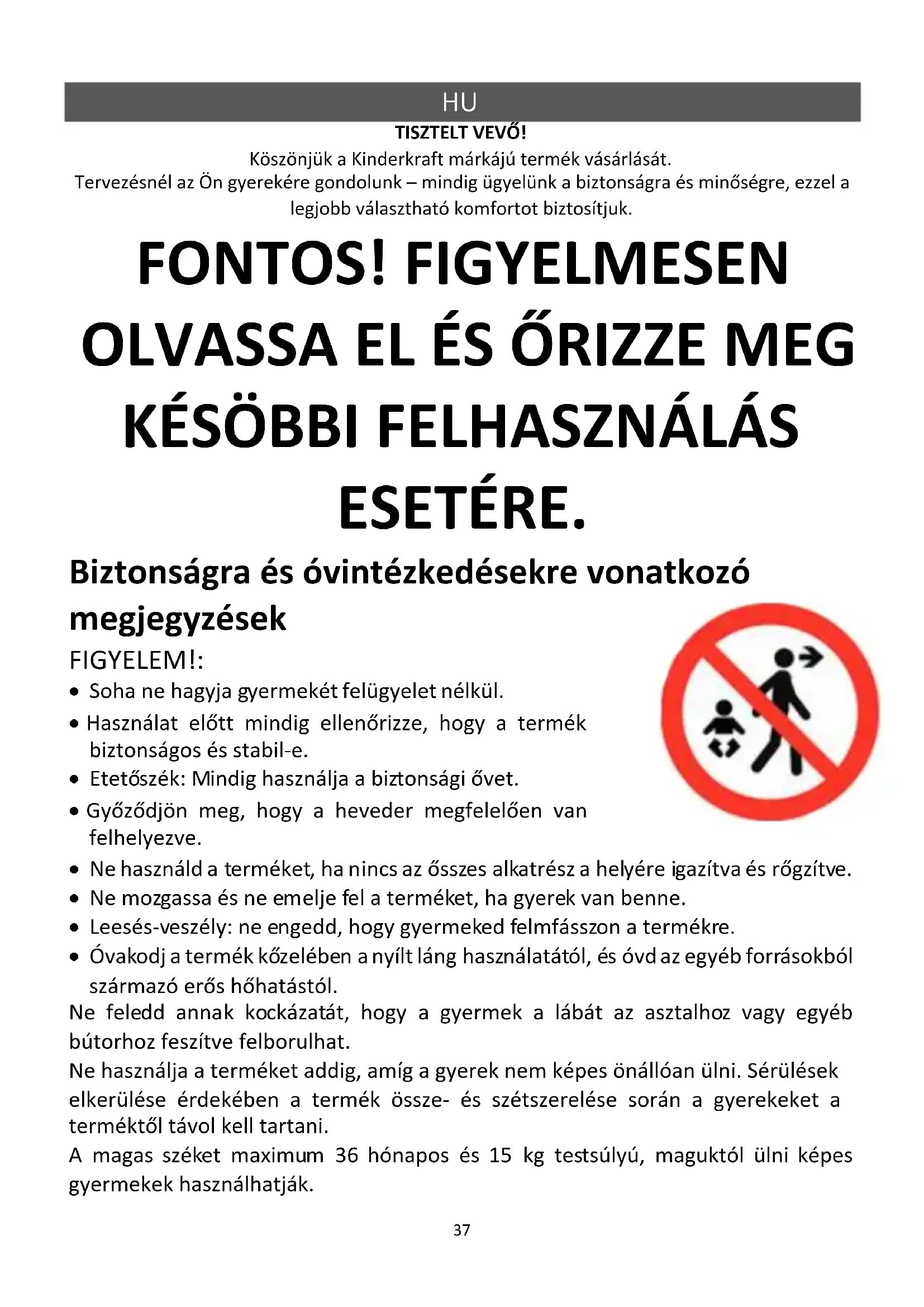- Óvakodj a termék kőzelében a nyílt láng használatától, és óvd az egyéb forrásokból származó erős hőhatástól. Ne feledd annak kockázatát, hogy a gyermek a lábát az asztalhoz vagy egyéb bútorhoz feszítve felborulhat. Ne használja a terméket addig, amíg a gyerek nem képes önállóan ülni. Sérülések elkerülése érdekében a termék össze- és szétszerelése során a gyerekeket a terméktől távol kell tartani. A magas széket maximum 36 hónapos és 15 kg testsúlyú, maguktól ülni képes gyermekek használhatják.38 Figyelemmel kell lenni olyan kockázatokra, mint nyílt láng vagy más magas hőmérsékletű források, mint pl. elektromos- vagy gáztűzhelyek a termék közelében. Nem szabad a gyártó által jóváhagyottaktól eltérő tartozékokat vagy alkatrészeket használni.