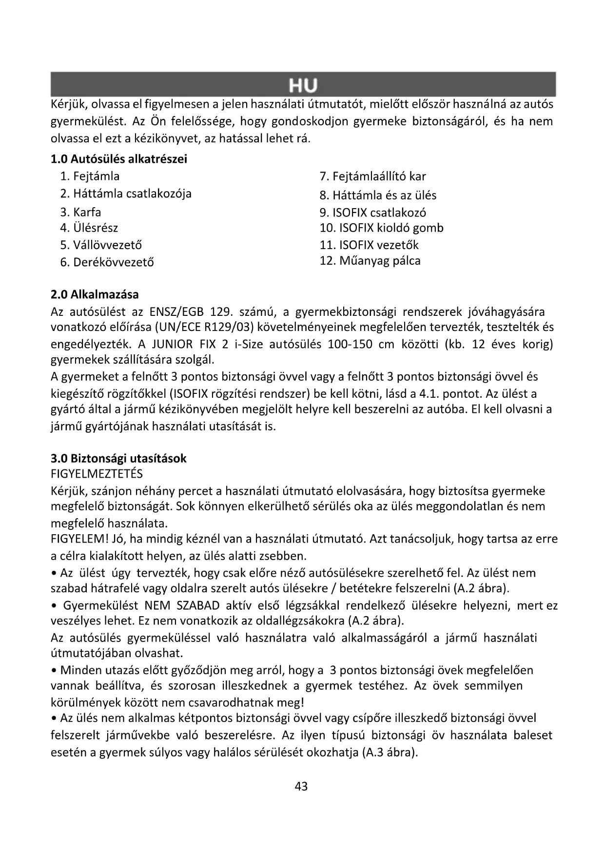 Az autósülést az ENSZ/EGB 129. számú, a gyermekbiztonsági rendszerek jóváhagyására vonatkozó előírása (UN/ECE R129/03) követelményeinek megfelelően tervezték, tesztelték és engedélyezték. A JUNIOR FIX 2 i-Size autósülés 100-150 cm közötti (kb. 12 éves korig) gyermekek szállítására szolgál. A gyermeket a felnőtt 3 pontos biztonsági övvel vagy a felnőtt 3 pontos biztonsági övvel és kiegészítő rögzítőkkel (ISOFIX rögzítési rendszer) be kell kötni, lásd a 4.1. pontot. Az ülést a gyártó által a jármű kézikönyvében megjelölt helyre kell beszerelni az autóba. El kell olvasni a jármű gyártójának használati utasítását is.