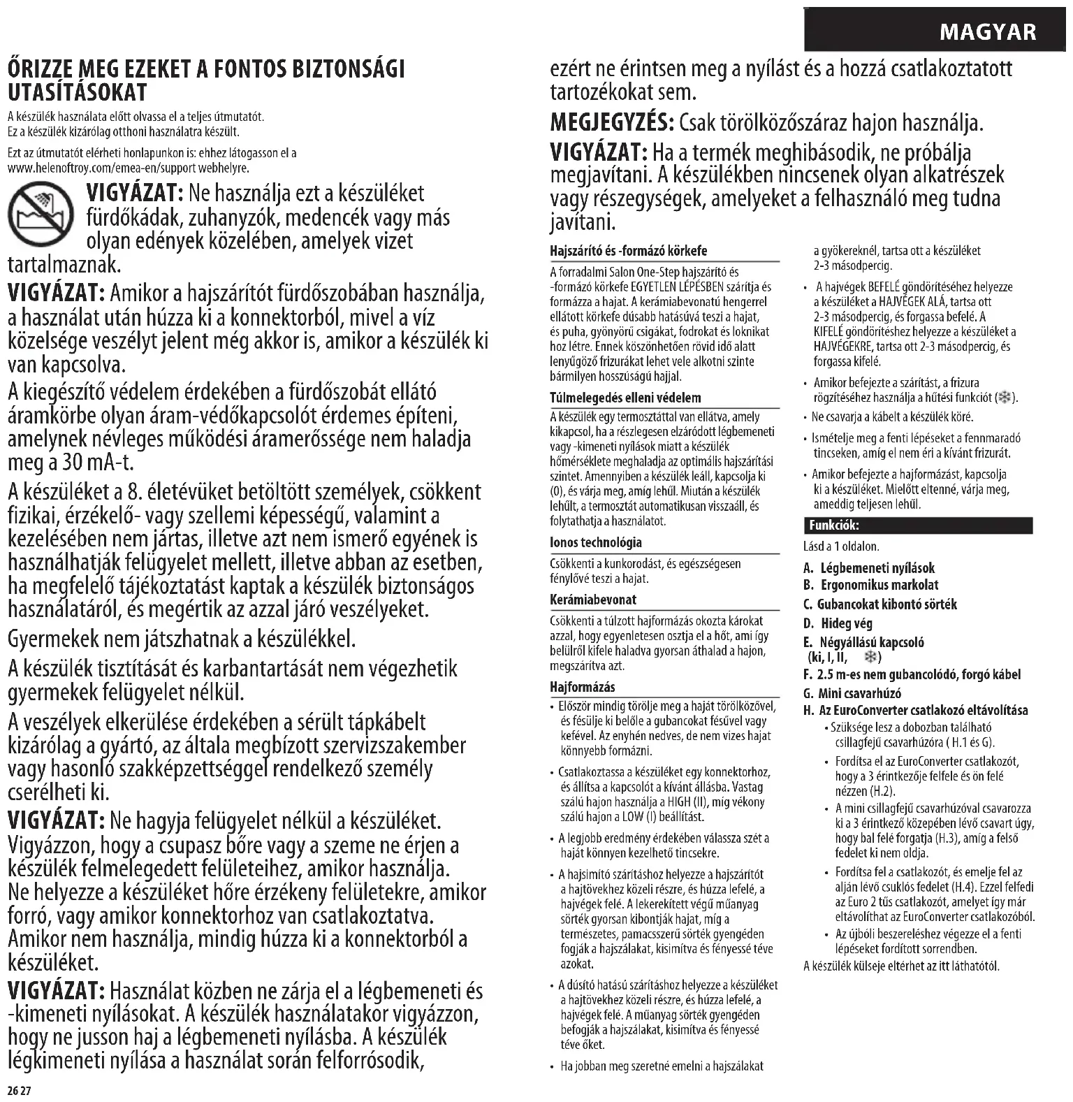 A készülék használata előtt olvassa el a teljes útmutatót. Ez a készülék kizárólag otthoni használatra készült. Ezt az útmutatót elérheti honlapunkon is: ehhez látogasson el a www.helenoftroy.com/emea-en/support webhelyre. VIGYÁZAT: Ne használja ezt a készüléket fürdőkádak, zuhanyzók, medencék vagy más olyan edények közelében, amelyek vizet tartalmaznak. VIGYÁZAT: Amikor a hajszárítót fürdőszobában használja, a használat után húzza ki a konnektorból, mivel a víz közelsége veszélyt jelent még akkor is, amikor a készülék ki van kapcsolva. A kiegészítő védelem érdekében a fürdőszobát ellátó áramkörbe olyan áram-védőkapcsolót érdemes építeni, amelynek névleges működési áramerőssége nem haladja meg a 30 mA-t. A készüléket a 8. életévüket betöltött személyek, csökkent fizikai, érzékelő- vagy szellemi képességű, valamint a kezelésében nem jártas, illetve azt nem ismerő egyének is használhatják felügyelet mellett, illetve abban az esetben, ha megfelelő tájékoztatást kaptak a készülék biztonságos használatáról, és megértik az azzal járó veszélyeket. Gyermekek nem játszhatnak a készülékkel. A készülék tisztítását és karbantartását nem végezhetik gyermekek felügyelet nélkül. A veszélyek elkerülése érdekében a sérült tápkábelt kizárólag a gyártó, az általa megbízott szervizszakember vagy hasonló szakképzettséggel rendelkező személy cserélheti ki. VIGYÁZAT: Ne hagyja felügyelet nélkül a készüléket. Vigyázzon, hogy a csupasz bőre vagy a szeme ne érjen a készülék felmelegedett felületeihez, amikor használja. Ne helyezze a készüléket hőre érzékeny felületekre, amikor forró, vagy amikor konnektorhoz van csatlakoztatva. Amikor nem használja, mindig húzza ki a konnektorból a készüléket. VIGYÁZAT: Használat közben ne zárja el a légbemeneti és -kimeneti nyílásokat. A készülék használatakor vigyázzon, hogy ne jusson haj a légbemeneti nyílásba. A készülék légkimeneti nyílása a használat során felforrósodik, ezért ne érintsen meg a nyílást és a hozzá csatlakoztatott tartozékokat sem. MEGJEGYZÉS: Csak törölközőszáraz hajon használja. VIGYÁZAT: Ha a termék meghibásodik, ne próbálja megjavítani. A készülékben nincsenek olyan alkatrészek vagy részegységek, amelyeket a felhasználó meg tudna javítani. MAGYAR Hajszárító és -formázó körkefe A forradalmi Salon One-Step hajszárító és -formázó körkefe EGYETLEN LÉPÉSBEN szárítja és formázza a hajat. A kerámiabevonatú hengerrel ellátott körkefe dúsabb hatásúvá teszi a hajat, és puha, gyönyörű csigákat, fodrokat és loknikat hoz létre. Ennek köszönhetően rövid idő alatt lenyűgöző frizurákat lehet vele alkotni szinte bármilyen hosszúságú hajjal. Túlmelegedés elleni védelem A készülék egy termosztáttal van ellátva, amely kikapcsol, ha a részlegesen elzáródott légbemeneti vagy -kimeneti nyílások miatt a készülék hőmérséklete meghaladja az optimális hajszárítási szintet. Amennyiben a készülék leáll, kapcsolja ki (0), és várja meg, amíg lehűl. Miután a készülék lehűlt, a termosztát automatikusan visszaáll, és folytathatja a használatot. Ionos technológia Csökkenti a kunkorodást, és egészségesen fénylővé teszi a hajat. Kerámiabevonat Csökkenti a túlzott hajformázás okozta károkat azzal, hogy egyenletesen osztja el a hőt, ami így belülről kifele haladva gyorsan áthalad a hajon, megszárítva azt. Hajformázás