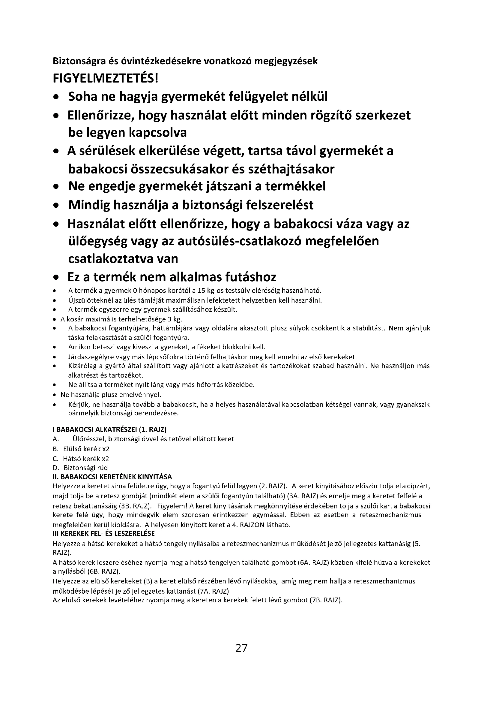 Tisztelt Vevők! Köszönjük a Kinderkraft márkájú termék vásárlását. Tervezésnél az Ön gyerekére gondolunk – mindig ügyelünk a biztonságra és minőségre, ezzel a legjobb választható komfortot biztosítjuk. Ez a babakocsi ideális megoldás azoknak, akik értékelik a minőséget, modernséget és a funkcionalitást. Kérjük, ismerkedjen meg a használati utasítás tartalmával, és tartsa be annak ajánlásait. Fontos – Figyelmesen olvassa el és őrizze meg későbbi felhasználás esetére27 Biztonságra és óvintézkedésekre vonatkozó megjegyzések FIGYELMEZTETÉS!