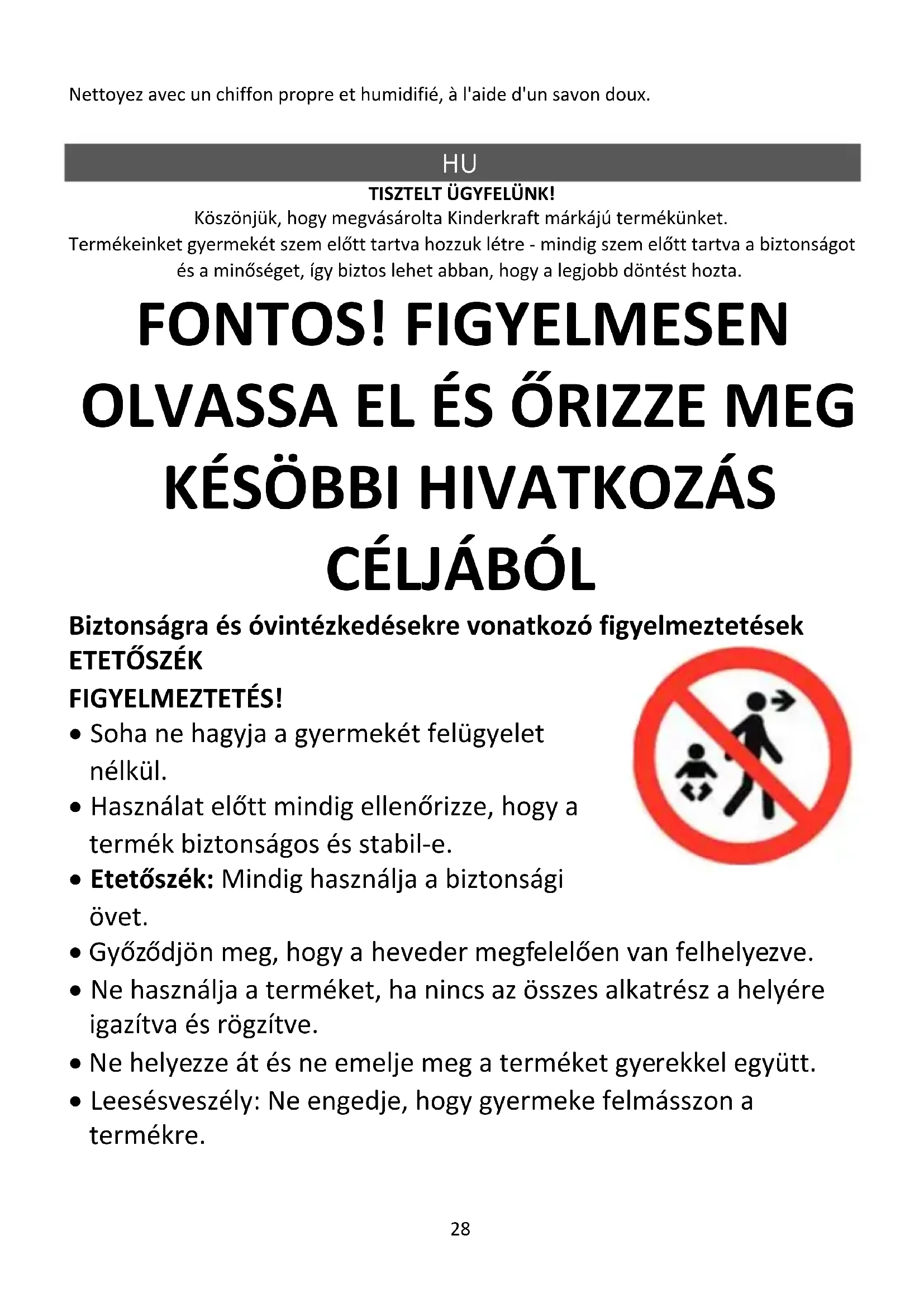 - Vegye figyelembe a felborulás kockázatát, ha a gyermek a lábát az asztalnak vagy egyéb bútornak feszíti. Ne használja a terméket addig, amíg gyermeke nem tud önállóan ülni. A sérülések elkerülése érdekében a termék össze- és szétszerelésekor tartsa távol a gyerekeket. A magas széket maximum 36 hónapos és 15 kg testsúlyú, maguktól ülni képes gyermekek használhatják. Ne használja a terméket ha repedést, szakadást vél észrevenni, vagy bármelyik alkatrész hiányzik. A gyerekek felkapaszkodhatnak az ablak alá helyezett termékre, ami kieséshez vezethet. Csak gyártó által ajánlott tartozékokat és cserealkatrészeket használjon.