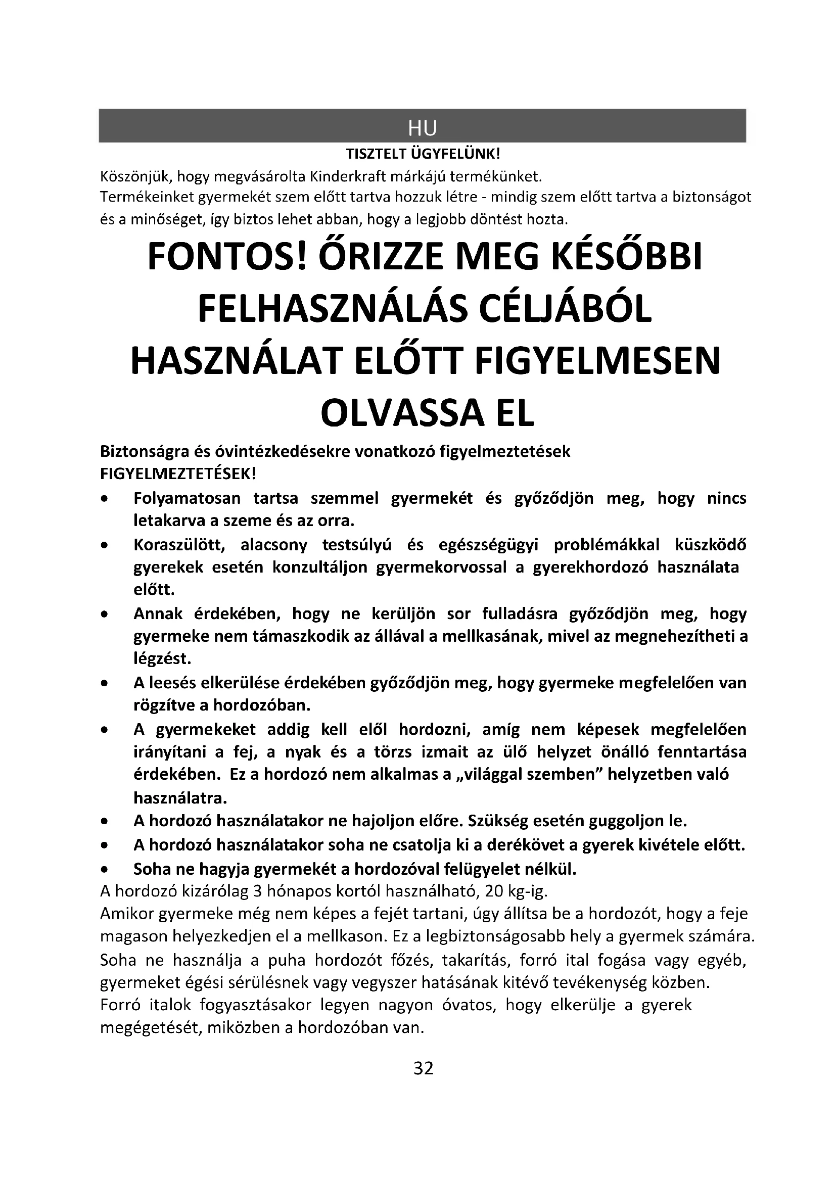 - A gyermekeket addig kell elől hordozni, amíg nem képesek megfelelően irányítani a fej, a nyak és a törzs izmait az ülő helyzet önálló fenntartása érdekében. Ez a hordozó nem alkalmas a „világgal szemben” helyzetben való használatra.