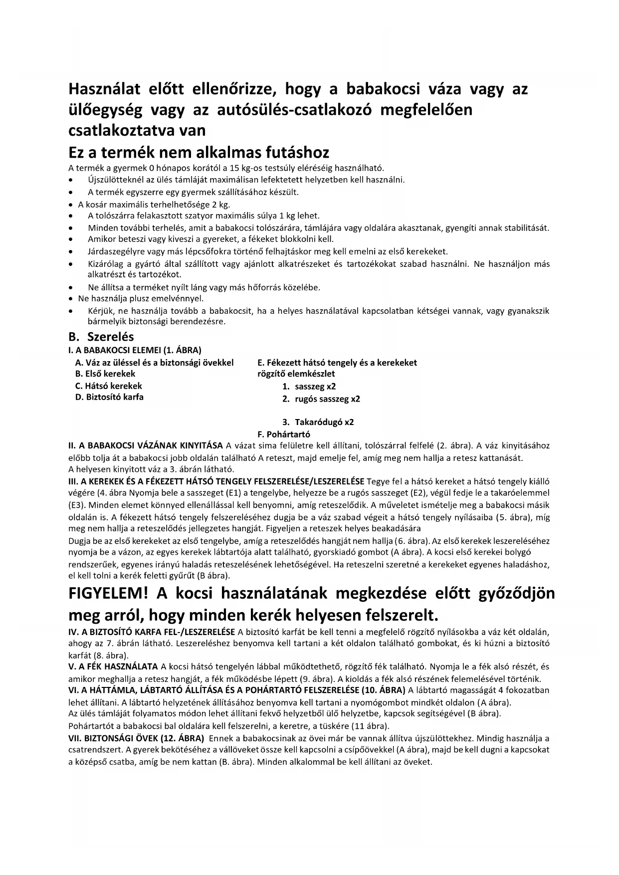 - Kérjük, ne használja tovább a babakocsit, ha a helyes használatával kapcsolatban kétségei vannak, vagy gyanakszik bármelyik biztonsági berendezésre. B. Szerelés