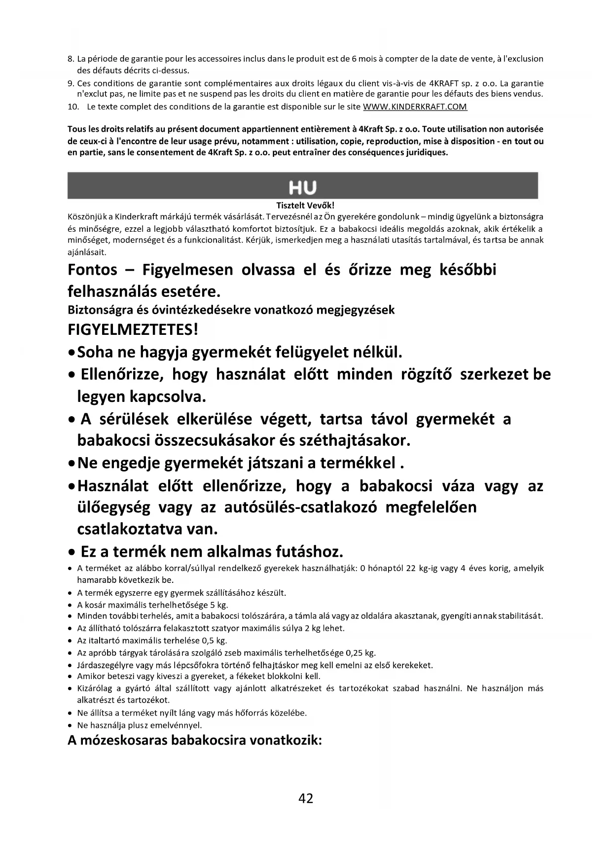 Tous les droits relatifs au présent document appartiennent entièrement à 4Kraft Sp. z o.o. Toute utilisation non autorisée de ceux-ci à l'encontre de leur usage prévu, notamment : utilisation, copie, reproduction, mise à disposition - en tout ou en partie, sans le consentement de 4Kraft Sp. z o.o. peut entraîner des conséquences juridiques. Tisztelt Vevők! Köszönjük a Kinderkraft márkájú termék vásárlását. Tervezésnél az Ön gyerekére gondolunk – mindig ügyelünk a biztonságra és minőségre, ezzel a legjobb választható komfortot biztosítjuk. Ez a babakocsi ideális megoldás azoknak, akik értékelik a minőséget, modernséget és a funkcionalitást. Kérjük, ismerkedjen meg a használati utasítás tartalmával, és tartsa be annak ajánlásait. Fontos – Figyelmesen olvassa el és őrizze meg későbbi felhasználás esetére. Biztonságra és óvintézkedésekre vonatkozó megjegyzések FIGYELMEZTETES!