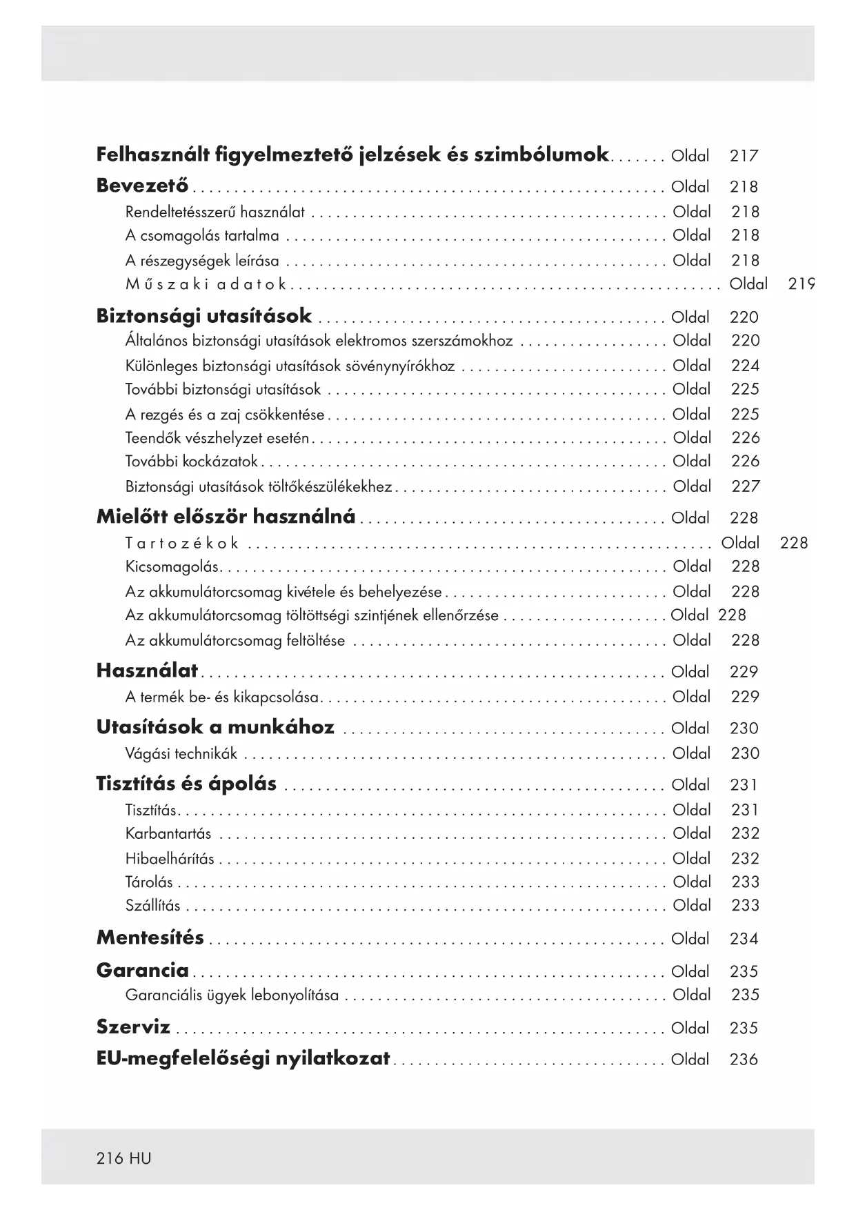 Felhasznált figyelmeztető jelzések és szimbólumok....... Oldal 217 Bevezető ......................................................... Oldal 218 Rendeltetésszerű használat ........................................... Oldal 218 A csomagolás tartalma .............................................. Oldal 218 A részegységek leírása .............................................. Oldal 218 Műszaki adatok.................................................... Oldal 219 Biztonsági utasítások .......................................... Oldal 220 Általános biztonsági utasítások elektromos szerszámokhoz .................. Oldal 220 Különleges biztonsági utasítások sövénynyírókhoz ......................... Oldal 224 További biztonsági utasítások ......................................... Oldal 225 A rezgés és a zaj csökkentése ......................................... Oldal 225 Teendők vészhelyzet esetén........................................... Oldal 226 További kockázatok ................................................. Oldal 226 Biztonsági utasítások töltőkészülékekhez ................................. Oldal 227 Mielőtt először használná ..................................... Oldal 228 Tartozékok ........................................................ Oldal 228 Kicsomagolás...................................................... Oldal 228 Az akkumulátorcsomag kivétele és behelyezése ........................... Oldal 228 Az akkumulátorcsomag töltöttségi szintjének ellenőrzése . . . . . . . . . . . . . . . . . . . . Oldal 228 Az akkumulátorcsomag feltöltése ...................................... Oldal 228 Használat........................................................ Oldal 229 A termék be- és kikapcsolása.......................................... Oldal 229 Utasítások a munkához ....................................... Oldal 230 Vágási technikák ................................................... Oldal 230 Tisztítás és ápolás .............................................. Oldal 231 Tisztítás........................................................... Oldal 231 Karbantartás ...................................................... Oldal 232 Hibaelhárítás ...................................................... Oldal 232 Tárolás . . . . . . . . . . . . . . . . . . . . . . . . . . . . . . . . . . . . . . . . . . . . . . . . . . . . . . . . . . . Oldal 233 Szállítás .......................................................... Oldal 233 Mentesítés ....................................................... Oldal 234 Garancia ......................................................... Oldal 235 Garanciális ügyek lebonyolítása ....................................... Oldal 235 Szerviz ........................................................... Oldal 235 EU-megfelelőségi nyilatkozat................................. Oldal 236217