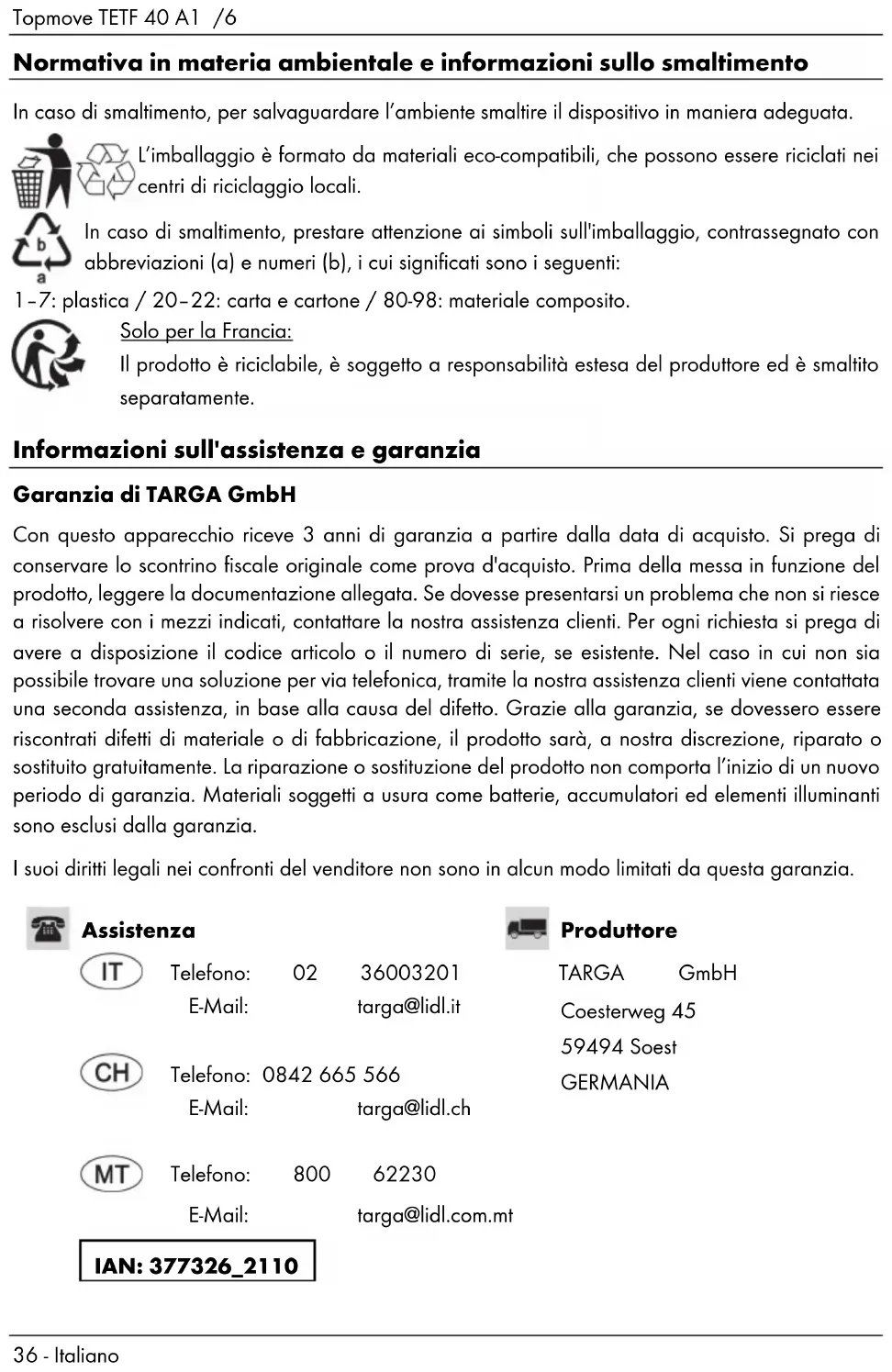 - Esernyő- vagy sétapálcatartó (a táskán kívül). Tisztítás és tárolás A gurulós bevásárlótáska tisztításához egy enyhén nedves kendőt használjon. Sohase használjon oldószert vagy egyéb tisztítószert, mivel ezek kárt tehetnek a műanyag alkatrészekben. Makacs szennyeződések esetén tegyen egy kis tisztítószert a nedves kendőre. Majd egy száraz kendővel szárítsa meg a bevásárlókocsit. Ha hosszabb ideig nem használja a gurulós bevásárlótáskát, akkor vegyen ki belőle mindent. Tiszta, száraz, közvetlen napsütéstől védett helyen tárolja a gurulós bevásárlótáskát.Topmove TETF 40 A1 /6 Magyar - 39 Környezetvédelmi előírások és hulladékkénti elhelyezési információ Amikor eléri az élettartama végét, akkor a környezet védelme érdekében az előírásoknak megfelelően helyezze el hulladékként. Környezetbarát anyagokból készült a csomagolás, melyek a helyi szelektív hulladékgyűjtő helyeken adhatóak le. A hulladékkénti elhelyezésekor figyeljen a csomagolóanyagon található jelzésekre, rövidítések (a) és számok (b) találhatóak bennük, amelyek jelentése: 1–7: műanyag / 20–22: papír és kartonpapír / 80-98: kompozit anyagok. Csak Franciaországban: Az újrafelhasználható termékre kiterjesztett gyártói felelősség vonatkozik. A terméket szelektív hulladékkezeléssel kell ártalmatlanítani Garanciális és szerviz tájékoztatás A TARGA GmbH által nyújtott garancia E készülék garanciája 3 év a vásárlás időpontjától számítva. Jól őrizze meg az eredeti kasszaszalagot, ez szolgál vásárlási bizonylatként. A termék üzembe helyezése előtt olvassa át a mellékelt dokumentációt. Amennyiben olyan probléma jelentkezik, amelyet így nem lehet megoldani, forduljon a forródrót szolgálatunkhoz. Bármilyen kérés esetén tartsa készenlétben a cikkszámot, vagy ha van ilyen, a sorozatszámot. Amennyiben a telefonos megoldás nem lehetséges, a forródrót szolgáltatásunk a hiba okától függően egy szervizmegoldást kezdeményez. A garancia ideje alatt a terméket anyag vagy gyártási hiba esetén a saját belátásunk szerint ingyenesen megjavítjuk vagy kicseréljük. A termék javításával vagy cseréjével nem kezdődik újra a garancia érvényessége. A fogyó anyagok, mint például elemek, akkumulátorok és égők nem képezik a garancia tárgyát. Nem érinti, illetve nem korlátozza e garancia az eladóval szemben fennálló törvényen alapuló jogait.