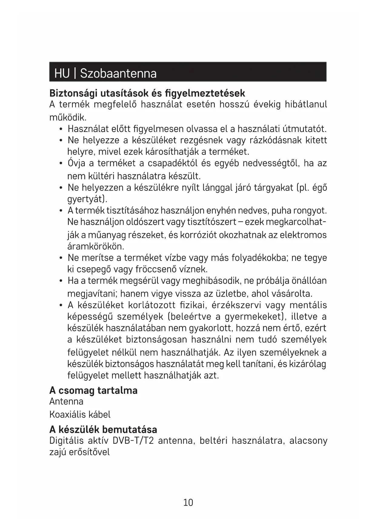 - A készüléket korlátozott zikai, érzékszervi vagy mentális képességű személyek (beleértve a gyermekeket), illetve a készülék használatában nem gyakorlott, hozzá nem értő, ezért a készüléket biztonságosan használni nem tudó személyek felügyelet nélkül nem használhatják. Az ilyen személyeknek a készülék biztonságos használatát meg kell tanítani, és kizárólag felügyelet mellett használhatják azt. A csomag tartalma Antenna Koaxiális kábel A készülék bemutatása Digitális aktív DVB-T/T2 antenna, beltéri használatra, alacsony zajú erősítővel11 Beszerelés