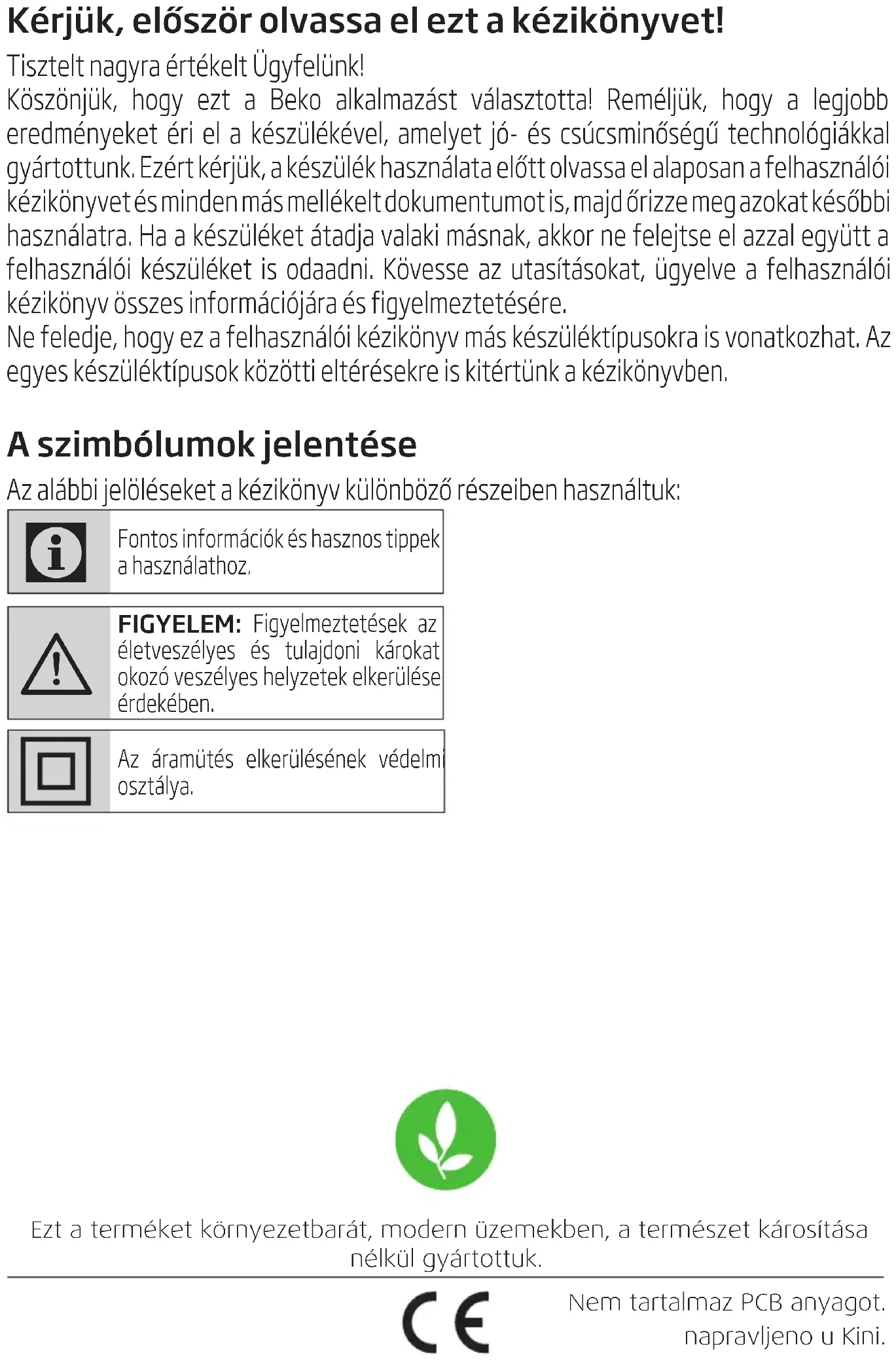 - Изпускането на уреда може да причини спиране на работата му или да доведе до трайна повреда. 4 Почистване и поддръжкаKérjük, először olvassa el ezt a kézikönyvet! Tisztelt nagyra értékelt Ügyfelünk! Köszönjük, hogy ezt a Beko alkalmazást választotta! Reméljük, hogy a legjobb eredményeket éri el a készülékével, amelyet jó- és csúcsminőségű technológiákkal gyártottunk. Ezért kérjük, a készülék használata előtt olvassa el alaposan a felhasználói kézikönyvet és minden más mellékelt dokumentumot is, majd őrizze meg azokat későbbi használatra. Ha a készüléket átadja valaki másnak, akkor ne felejtse el azzal együtt a felhasználói készüléket is odaadni. Kövesse az utasításokat, ügyelve a felhasználói kézikönyv összes információjára és figyelmeztetésére. Ne feledje, hogy ez a felhasználói kézikönyv más készüléktípusokra is vonatkozhat. Az egyes készüléktípusok közötti eltérésekre is kitértünk a kézikönyvben. A szimbólumok jelentése Az alábbi jelöléseket a kézikönyv különböző részeiben használtuk: