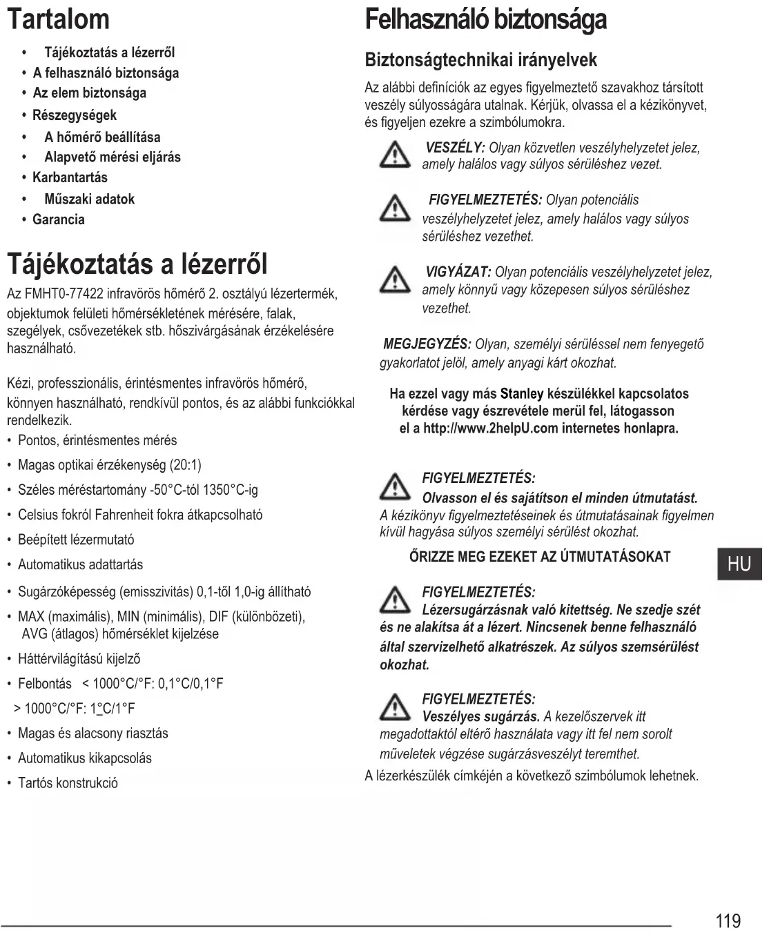 Ez a garancia nem terjed ki olyan meghibásodásokra, amelyek véletlen károsodásból, normál elhasználódásból és kopásból származnak, vagy ha a terméket nem a gyártó útmutatásai szerint használták, illetve ha a Stanley által nem engedélyezett javítást vagy módosítást végeztek rajta. Jelen garancia hatálya alatt végzett javítás vagy csere nem befolyásolja a garancia lejáratának időpontját. A jogszabály által meghatározott mértékig, a Stanley garanciája nem terjed ki a termék meghibásodásaiból eredő közvetett vagy járulékos károkra. Ez a garancia a Stanley engedélye nélkül nem módosítható. Jelen garancia nem befolyásolja a termék vásárlóinak törvényben garantált jogait. Jelen garanciára és annak értelmezésére annak az országnak a joghatósága az irányadó, amelyikben a terméket eladták, továbbá mind a Stanley, mind a vásárló visszavonhatatlanul megegyeznek abban, hogy a jelen garancia hatálya alatt vagy azzal kapcsolatban felmerülő bármilyen igényt annak az országnak a joghatóságához fognak benyújtani. A műszer kalibrálására és gondozására nem terjed ki a garancia. TARTSASZEMELŐTT: A készülék helyes használatáért és gondozásáért a vásárló a felelős. A vásárló ezenkívül teljes mértékben felelős a lézeregység pontosságának rendszeres ellenőrzéséért és azáltal a műszer kalibrálásáért. Ez a kézikönyv előzetes értesítés nélkül is módosítható.126