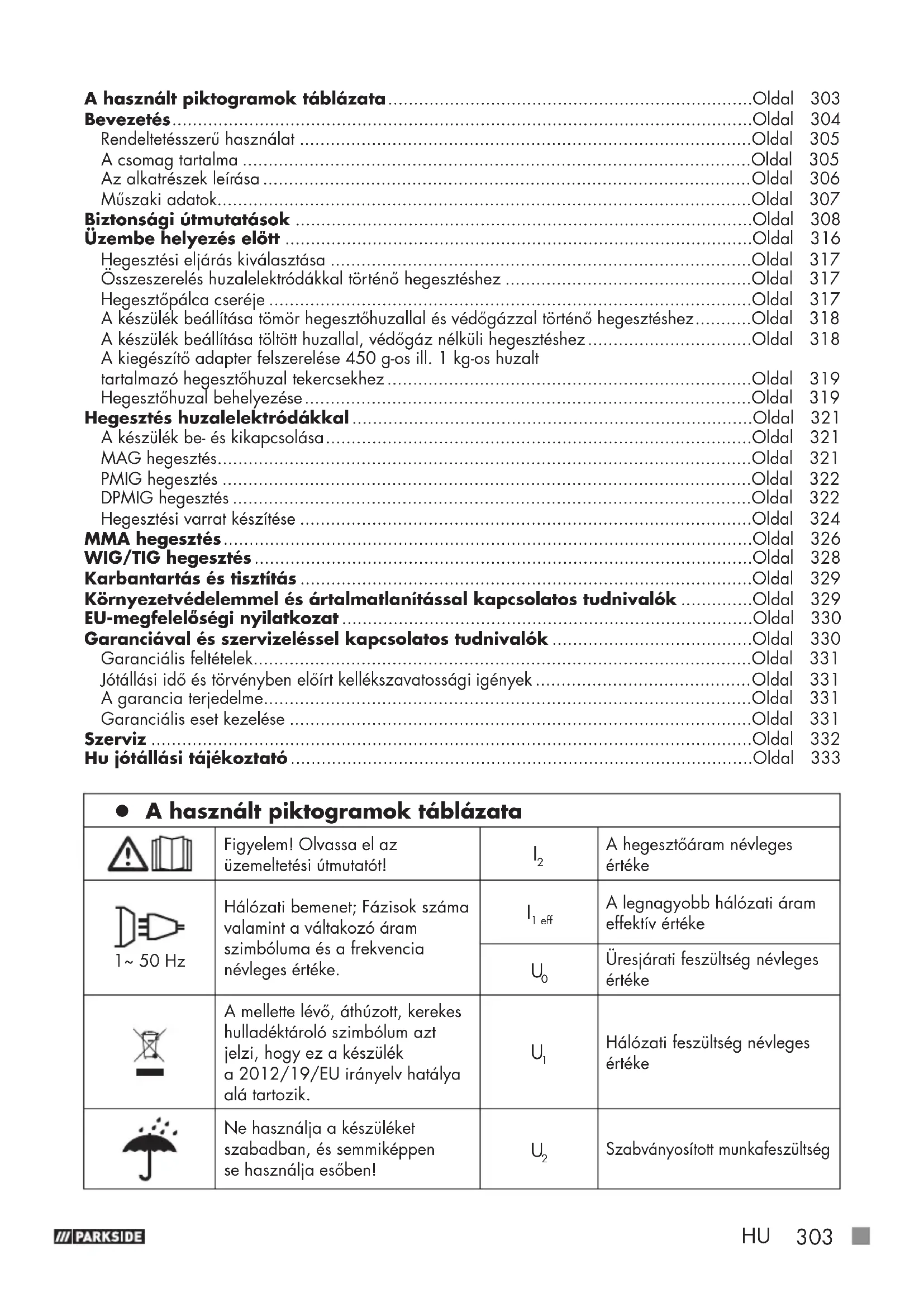 Szabványosított munkafeszültség A használt piktogramok táblázata .......................................................................Oldal 303 Bevezetés .................................................................................................................Oldal 304 Rendeltetésszerű használat ........................................................................................Oldal 305 A csomag tartalma ...................................................................................................Oldal 305 Az alkatrészek leírása ...............................................................................................Oldal 306 Műszaki adatok........................................................................................................Oldal 307 Biztonsági útmutatások .........................................................................................Oldal 308 Üzembe helyezés előtt ...........................................................................................Oldal 316 Hegesztési eljárás kiválasztása ..................................................................................Oldal 317 Összeszerelés huzalelektródákkal történő hegesztéshez ................................................Oldal 317 Hegesztőpálca cseréje ..............................................................................................Oldal 317 A készülék beállítása tömör hegesztőhuzallal és védőgázzal történő hegesztéshez ...........Oldal 318 A készülék beállítása töltött huzallal, védőgáz nélküli hegesztéshez ................................Oldal 318 A kiegészítő adapter felszerelése 450 g-os ill. 1 kg-os huzalt tartalmazó hegesztőhuzal tekercsekhez .......................................................................Oldal 319 Hegesztőhuzal behelyezése .......................................................................................Oldal 319 Hegesztés huzalelektródákkal ..............................................................................Oldal 321 A készülék be- és kikapcsolása ...................................................................................Oldal 321 MAG hegesztés ........................................................................................................Oldal 321 PMIG hegesztés .......................................................................................................Oldal 322 DPMIG hegesztés .....................................................................................................Oldal 322 Hegesztési varrat készítése ........................................................................................Oldal 324 MMA hegesztés .......................................................................................................Oldal 326 WIG/TIG hegesztés .................................................................................................Oldal 328 Karbantartás és tisztítás ........................................................................................Oldal 329 Környezetvédelemmel és ártalmatlanítással kapcsolatos tudnivalók ..............Oldal 329 EU-megfelelőségi nyilatkozat ................................................................................Oldal 330 Garanciával és szervizeléssel kapcsolatos tudnivalók .......................................Oldal 330 Garanciális feltételek .................................................................................................Oldal 331 Jótállási idő és törvényben előírt kellékszavatossági igények ..........................................Oldal 331 A garancia terjedelme ...............................................................................................Oldal 331 Garanciális eset kezelése ..........................................................................................Oldal 331 Szerviz .....................................................................................................................Oldal 332 Hu jótállási tájékoztató ..........................................................................................Oldal 333304