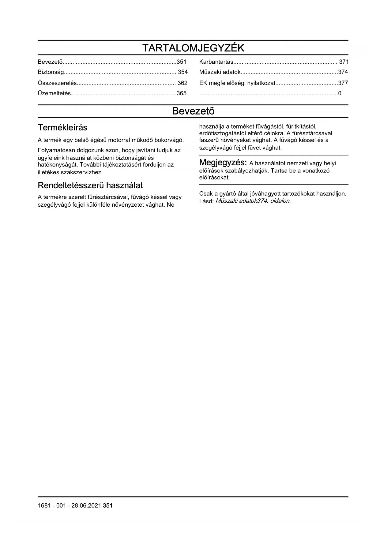 Bevezető Termékleírás A termék egy belső égésű motorral működő bokorvágó. Folyamatosan dolgozunk azon, hogy javítani tudjuk az ügyfeleink használat közbeni biztonságát és hatékonyságát. További tájékoztatásért forduljon az illetékes szakszervizhez. Rendeltetésszerű használat A termékre szerelt fűrésztárcsával, fűvágó késsel vagy szegélyvágó fejjel különféle növényzetet vághat. Ne használja a terméket fűvágástól, fűritkítástól, erdőtisztogatástól eltérő célokra. A fűrésztárcsával faszerű növényeket vághat. A fűvágó késsel és a szegélyvágó fejjel füvet vághat. Megjegyzés: A használatot nemzeti vagy helyi előírások szabályozhatják. Tartsa be a vonatkozó előírásokat. Csak a gyártó által jóváhagyott tartozékokat használjon. Lásd: Műszaki adatok374. oldalon