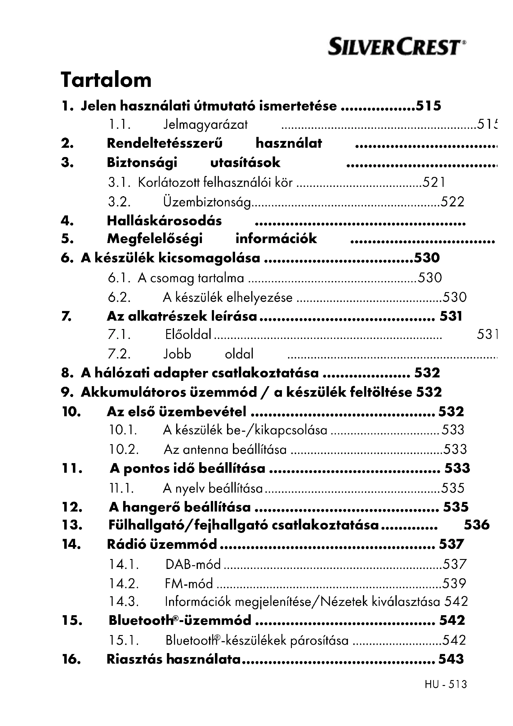 Hozzájárulásunk nélkül ne alakítsa át a készü- léket, és ne használjon általunk nem engedé- lyezett vagy nem általunk szállított kiegészítő eszközöket. Csak az általunk szállított vagy engedélyezett pótalkatrészeket és tartozékokat használja. Vegye figyelembe a jelen használati útmutató- ban szereplő összes információt, különöskép- pen a biztonsági utasításokat. Ne használja robbanásveszélyes területeken a készüléket. Ide tartoznak a tartályok, az üzem- anyag-tárolás területei, illetve azok a terüle- tek, ahol oldószereket használnak. A készülé- ket részecskékkel (pl. liszt- vagy fapor) telített levegőjű területeken sem szabad használni. Ne tegye ki a készüléket szélsőséges körülmé- nyeknek. Kerülje a következőket: − magas páratartalom vagy nedvesség, − rendkívül magas vagy alacsony hőmérsék- letek, − közvetlen napsugárzás, − nyílt láng.HU - 521 3.1. Korlátozott felhasználói kör 8éven felüli gyermekek, valamint csökkent fi- zikai, érzékszervi vagy mentális képességekkel rendelkező személyek, illetve kellő tapaszta- lattal és ismeretekkel nem rendelkező szemé- lyek is használhatják ezt a készüléket, ameny- nyiben ez felügyelet mellett történik, vagy ha betanították őket a készülék biztonságos hasz- nálatára, és megértik a használatból fakadó veszélyeket. Gyermekek nem játszhatnak a készülékkel. Gyermekek felügyelet nélkül nem tisztíthatják a készüléket és nem végezhetnek felhasználói karbantartást. A készüléket és tartozékait gyermekek számá- ra nem elérhető helyen tárolja. VESZÉLY! Fulladásveszély! Apróbb alkatrészek vagy fólia lenyelése, illetve belélegzése következtében fennálló fulladásveszély. A csomagolóanyag nem gyermekjáték. Gyer- mekek nem játszhatnak a műanyag zacskók-522 - HU kal. Fulladásveszély áll fenn. 3.2. Üzembiztonság Használat előtt ellenőrizze a készüléket és a hálózati tápegységet, hogy nem sérültek-e. Hi- bás vagy sérült rádiókészüléket vagy hálózati tápegységet nem szabad használni. Ne tegyen vízzel teli edényt, pl. vázát a készü- lékre vagy annak közvetlen közelébe, és védje minden részét a rácseppenő vagy -fröccsenő víztől. Az edény felborulhat, és a kiömlő folya- dék negatívan befolyásolhatja az elektromos biztonságot. A hálózati adapter, a csatlakozókábel vagy a készülék sérülése esetén azonnal húzza ki a hálózati csatlakozót az aljzatból. Mindig a csatlakozódugónál, soha ne a ká- belnél fogva húzza ki a hálózati kábelt a csat- lakozóaljzatból. Hidegről meleg helyre történő áthelyezés ese- tén pára csapódhat le a készülékben és a há- lózati adapterben. Várjon néhány órát, mielőtt üzembe helyezi a készüléket.HU - 523 Hosszabb távollét vagy zivatar esetén húzza ki a hálózati adaptert a csatlakozóaljzatból.