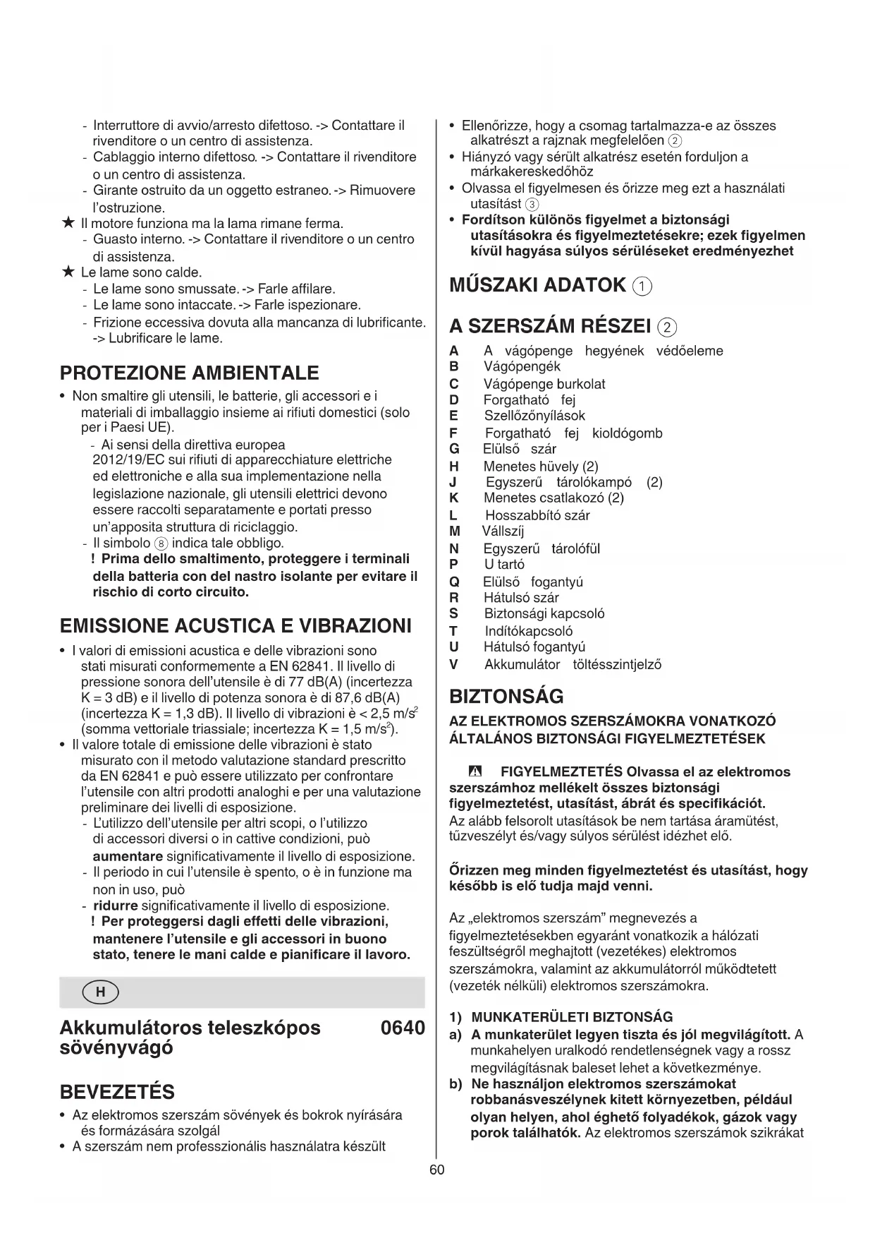 a) Legyen gyelmes, ügyeljen arra, amit csinál, és józan ésszel fogjon a munkához, ha elektromos szerszámot használ. Ne használja az elektromos szerszámot, ha fáradtnak érzi magát, vagy ha kábítószer, alkohol vagy gyógyszerek hatása alatt áll. Az elektromos szerszám üzemeltetése közben egy pillanatnyi gyelmetlenség is súlyos személyi sérülést okozhat. b) Használjon egyéni védőfelszerelést. Mindig viseljen védőszemüveget. A védőfelszerelések, mint például porvédő maszk, csúszásmentes lábbeli, sisak és hallásvédő, rendeltetésszerű használata révén elkerüli a sérülési veszélyeket. c) Akadályozza meg a véletlen indítást. Ügyeljen arra, hogy a kapcsoló kikapcsolt állásban legyen, mielőtt az áramforráshoz és/vagy az akkumulátoregységhez csatlakoztatja, felveszi vagy viszi a szerszámot. Balesetekhez vezethet, ha a hálózatra csatlakoztatott szerszámot úgy viszi, hogy közben az ujja a bekapcsoló gombon van, vagy ha a hálózati csatlakozódugót olyankor dugja be az aljzatba, amikor be van kapcsolva a szerszám. d) Vegye ki a csavarkulcsot és a beállító szerszámot, mielőtt az elektromos szerszámot bekapcsolná. Az elektromos szerszám mozgó alkatrészén felejtett csavarkulcs vagy eszköz személyi sérülést okozhat. e) Ne hajoljon a szerszám fölé. Vegyen fel stabil62 c) A sövényvágó szállításakor vagy tárolásakor mindig helyezze fel a penge burkolatát. A sövényvágó megfelelő kezelése csökkenti a pengék okozta személyi sérülés veszélyét. d) Amikor eltávolítja a beszorult anyagot, vagy szervizeli az egységet, győződjön meg arról, hogy az elektromos kapcsolók ki vannak-e kapcsolva, és az akkucsomag el van-e távolítva, vagy le van-e kapcsolva.A sövényvágó váratlan működésbe hozatala a beszorult anyag eltávolítása vagy a szervizelés során súlyos személyi sérüléseket okozhat. e) A sövényvágót csak a szigetelt tartófelületeknél fogva tartsa, mivel a penge rejtett vezetéket érinthet. A feszültség alatti vezetékkel érintkező pengék feszültség alá helyezhetik a sövényvágó burkolat nélküli fémrészeit, és a gépkezelő áramütést szenvedhet. f) Az elektromos kábeleket és vezetékeket tartsa távol a vágóterülettől. Előfordulhat, hogy a hálózati kábelek vagy vezetékek nem láthatók a sövényben vagy a bozótokban, és ezeket véletlenül elvághatja a penge. g) Ne használja a sövényvágót rossz időjárási körülmények között, különösképpen, ha fennáll a villámlás veszélye. Ez megnöveli annak veszélyét, hogy eltalálja a villám. KIEGÉSZÍTŐ BIZTONSÁGI UTASÍTÁSOK TELESZKÓPOS