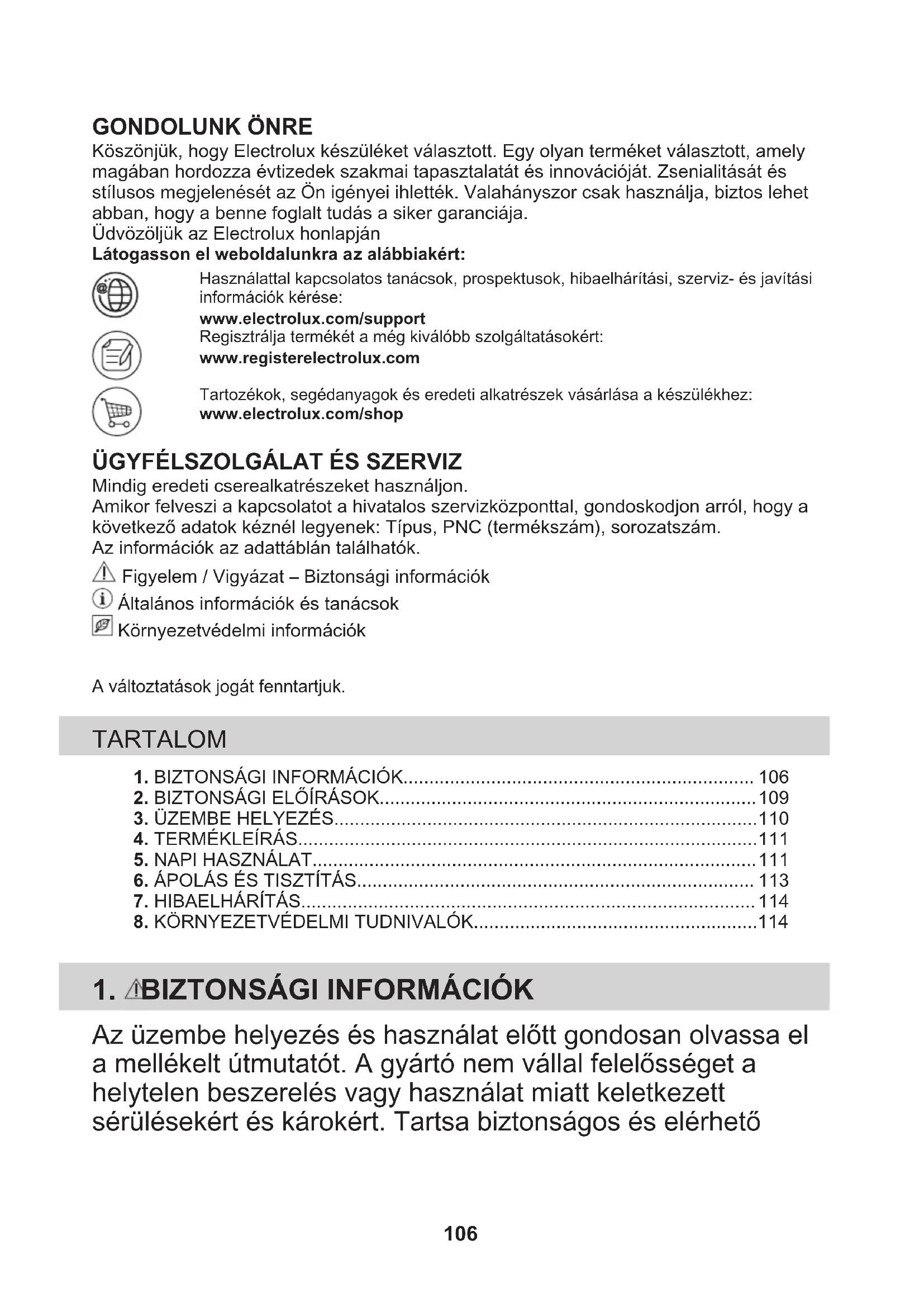 Reciklirajte materijale sa simbolom . Ambalažu za recikliranje odložite u prikladne spremnike. Pomozite u zaštiti okoliša i ljudskog zdravlja, kao i u recikliranju otpada od električnih i elektroničkih uređaja. Uređaje označene simbolom ne bacajte zajedno s kućnim otpadom. Proizvod odnesite na lokalno reciklažno mjesto ili kontaktirajte nadležnu službu. 105GONDOLUNK ÖNRE Köszönjük, hogy Electrolux készüléket választott. Egy olyan terméket választott, amelymagában hordozza évtizedek szakmai tapasztalatát és innovációját. Zsenialitását ésstílusos megjelenését az Ön igényei ihlették. Valahányszor csak használja, biztos lehetabban, hogy a benne foglalt tudás a siker garanciája.Üdvözöljük az Electrolux honlapjánLátogasson el weboldalunkra az alábbiakért:Használattal kapcsolatos tanácsok, prospektusok, hibaelhárítási, szerviz- és javításiinformációk kérése:www.electrolux.com/supportRegisztrálja termékét a még kiválóbb szolgáltatásokért:www.registerelectrolux.comTartozékok, segédanyagok és eredeti alkatrészek vásárlása a készülékhez:www.electrolux.com/shop