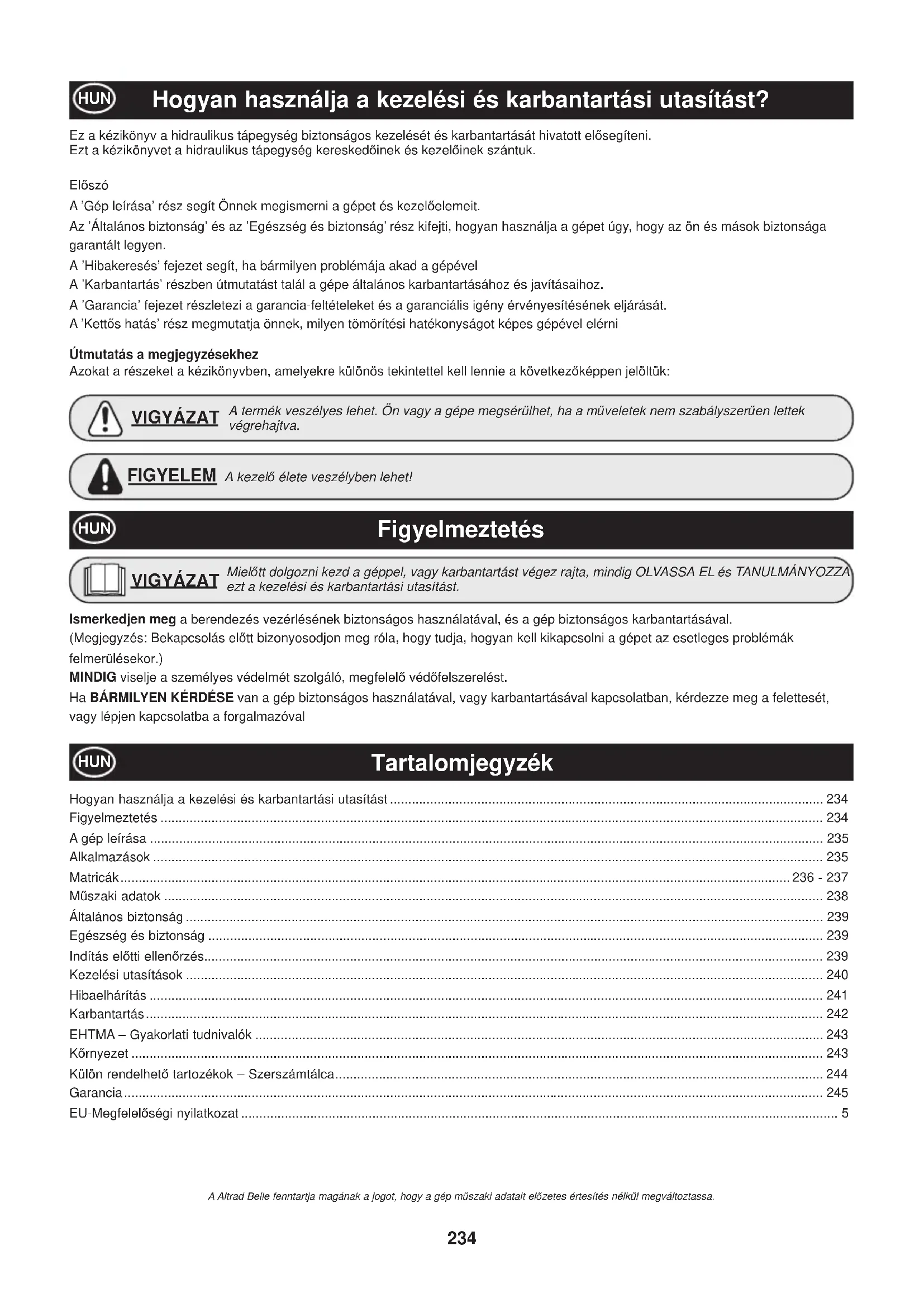 - Bujia motorului Altrad Belle úi/sau agenĠii săi autorizaĠi, directori, angajaĠi nu pot ¿ traúi la răspundere pentru alte defecte, pierderi sau cheltuieli cauzate de imposibilitatea de a utiliza utilajul în alte scopuri decât cel pentru care a fost conceput. Cererile de acordare ale garanĠiei Toate cererile de acordare ale garanĠiei tb. adresat în primul rând către Altrad Belle, ¿ e prin telefon, prin Fax, prin Email sau în scris. Pt. cereri de acordare a garanĠiei contactaĠi: Tel: +44(0)1298 84606 Fax: +44(0)1298 84073 Email : Warranty@belle-group.co.uk ScrieĠi la: Altrad Belle Warranty Department, Sheen, Nr. Buxton Derbyshire SK17 0EU England. Înregistrarea Garan܊iei: În eforturile companiei ALTRAD Belle de a deveni mai „verde” ܈i mai ecologică, am introdus acum înregistrarea online a garan܊iei. Pentru a accesa pagina de înregistrare a site-ului nostru, vă rugăm să utiliza܊i următoarea adresă:- http://www.bellegroup.com/index.php?p=warranty_registration În mod alternativ, pentru a accesa pagina de înregistrare, vă rugăm să scana܊i codul QR alăturat (cod de răspuns rapid) utilizând telefonul inteligent.234 Hogyan használja a kezelési és karbantartási utasítást? Ez a kézikönyv a hidraulikus tápegység biztonságos kezelését és karbantartását hivatott elĘsegíteni. Ezt a kézikönyvet a hidraulikus tápegység kereskedĘinek és kezelĘinek szántuk. ElĘszó A ’Gép leírása’ rész segít Önnek megismerni a gépet és kezelĘelemeit. Az ’Általános biztonság’ és az ’Egészség és biztonság’ rész kifejti, hogyan használja a gépet úgy, hogy az ön és mások biztonsága garantált legyen. A ’Hibakeresés’ fejezet segít, ha bármilyen problémája akad a gépével A ’Karbantartás’ részben útmutatást talál a gépe általános karbantartásához és javításaihoz. A ’Garancia’ fejezet részletezi a garancia-feltételeket és a garanciális igény érvényesítésének eljárását. A ’KettĘs hatás’ rész megmutatja önnek, milyen tömörítési hatékonyságot képes gépével elérni Útmutatás a megjegyzésekhez Azokat a részeket a kézikönyvben, amelyekre különös tekintettel kell lennie a következĘképpen jelöltük: Tartalomjegyzék HUN Hogyan használja a kezelési és karbantartási utasítást ....................................................................................................................... 234 Figyelmeztetés ...................................................................................................................................................................................... 234 A gép leírása ......................................................................................................................................................................................... 235 Alkalmazások ........................................................................................................................................................................................ 235 Matricák ........................................................................................................................................................................................236 - 237 MĦszaki adatok ..................................................................................................................................................................................... 238 Általános biztonság ............................................................................................................................................................................... 239 Egészség és biztonság ......................................................................................................................................................................... 239 Indítás elĘtti ellenĘrzés.......................................................................................................................................................................... 239 Kezelési utasítások ............................................................................................................................................................................... 240 Hibaelhárítás ......................................................................................................................................................................................... 241 Karbantartás .......................................................................................................................................................................................... 242 EHTMA – Gyakorlati tudnivalók ............................................................................................................................................................ 243 KĘrnyezet .............................................................................................................................................................................................. 243 Külön rendelhetĘ tartozékok – Szerszámtálca ...................................................................................................................................... 244 Garancia ................................................................................................................................................................................................ 245 EU-MegfelelĘségi nyilatkozat .................................................................................................................................................................... 5 HUN A Altrad Belle fenntartja magának a jogot, hogy a gép mĦszaki adatait elĘzetes értesítés nélkül megváltoztassa. MielĘtt dolgozni kezd a géppel, vagy karbantartást végez rajta, mindig OLVASSA EL és TANULMÁNYOZZA ezt a kezelési és karbantartási utasítást. VIGYÁ