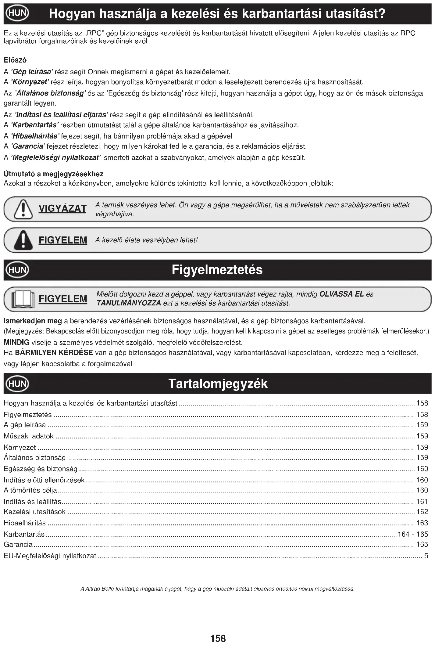 - zapalovací svíþka Altrad Belle a/nebo jeho zplnomocnČní zástupci, vedoucí pracovníci, zamČstnanci nebo zĜízenci nenesou odpovČdnost za další nebo jiné poškození, ztráty nebo náklady v souvislosti s (nebo díky) dĤvodĤm plynoucím z neschopnosti použít zaĜízení pro jiné úþely. Záruþní nároky Všechny záruþní nároky musí být nejdĜ íve smČrovány na oddČlení reklamací Altrad Belle, buć telefonicky, faxem, emailem nebo písemnČ. Adresa: Altrad Belle Warranty Department, Sheen, Nr. Buxton Derbyshire SK17 0EU England Tel: +44 (0)1298 84606 Fax: +44 (0)1298 84722 Email : warranty@belle-group.co.uk V pĜípadČ reverzního pohybu ovládací rukojeĢ bČží paralelnČ s domkem ve smČru obsluhy. NEBEZPEýÍ158 Hogyan használja a kezelési és karbantartási utasítást .......................................................................................................................158 Figyelmeztetés ...................................................................................................................................................................................... 158 A gép leírása ......................................................................................................................................................................................... 159 MĦszaki adatok ..................................................................................................................................................................................... 159 Környezet .............................................................................................................................................................................................. 159 Általános biztonság ............................................................................................................................................................................... 159 Egészség és biztonság ......................................................................................................................................................................... 160 Indítás elĘtti ellenĘrzések ...................................................................................................................................................................... 160 A tömörítés célja .................................................................................................................................................................................... 160 Indítás és leállítás.................................................................................................................................................................................. 161 Kezelési utasítások ............................................................................................................................................................................... 162 Hibaelhárítás ......................................................................................................................................................................................... 163 Karbantartás .................................................................................................................................................................................164 - 165 Garancia ................................................................................................................................................................................................ 165 EU-MegfelelĘségi nyilatkozat .................................................................................................................................................................... 5 Hogyan használja a kezelési és karbantartási utasítást? HUN A Altrad Belle fenntartja magának a jogot, hogy a gép mĦszaki adatait elĘzetes értesítés nélkül megváltoztassa. Ez a kezelési utasítás az „RPC” gép biztonságos kezelését és karbantartását hivatott elĘsegíteni. A jelen kezelési utasítás az RPC lapvibrátor forgalmazóinak és kezelĘinek szól. ElĘszó A ’Gép leírása’ rész segít Önnek megismerni a gépet és kezelĘelemeit. A ’Környezet’ rész leírja, hogyan bonyolítsa környezetbarát módon a leselejtezett berendezés újra hasznosítását. Az ’Általános biztonság’ és az ’Egészség és biztonság’ rész kifejti, hogyan használja a gépet úgy, hogy az ön és mások biztonsága garantált legyen. Az ’Indítási és leállítási eljárás’ rész segít a gép elindításánál és leállításánál. A ’Karbantartás’ részben útmutatást talál a gépe általános karbantartásához és javításaihoz. A ’Hibaelhárítás’ fejezet segít, ha bármilyen problémája akad a gépével A ’Garancia’ fejezet részletezi, hogy milyen károkat fed le a garancia, és a reklamációs eljárást. A ’MegfelelĘségi nyilatkozat’ ismerteti azokat a szabványokat, amelyek alapján a gép készült. Útmutató a megjegyzésekhez Azokat a részeket a kézikönyvben, amelyekre különös tekintettel kell lennie, a következĘképpen jelöltük: A termék veszélyes lehet. Ön vagy a gépe megsérülhet, ha a mĦveletek nem szabályszerĦen lettek végrehajtva. VIGYÁZAT A kezelĘ élete veszélyben lehet! FIGYELEM Figyelmeztetés HUN Tartalomjegyzék Ismerkedjen meg a berendezés vezérlésének biztonságos használatával, és a gép biztonságos karbantartásával. (Megjegyzés: Bekapcsolás elĘtt bizonyosodjon meg róla, hogy tudja, hogyan kell kikapcsolni a gépet az esetleges problémák felmerülésekor.) MINDIG viselje a személyes védelmét szolgáló, megfelelĘ védĘfelszerelést. Ha BÁRMILYEN KÉRDÉSE van a gép biztonságos használatával, vagy karbantartásával kapcsolatban, kérdezze meg a felettesét, vagy lépjen kapcsolatba a forgalmazóval HUN MielĘtt 