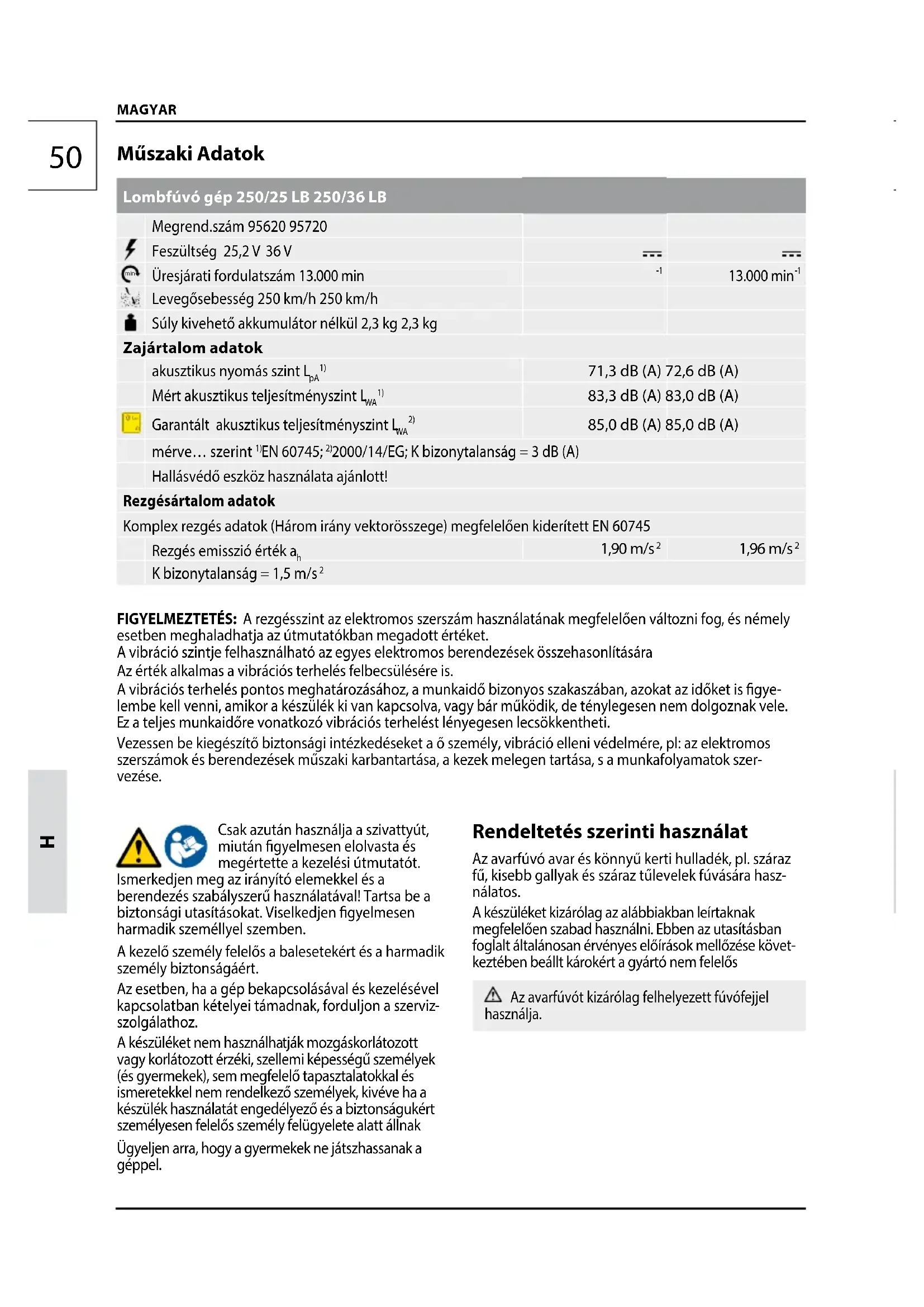 szolgálathoz. A készüléket nem használha tják mozgáskorlátozott vagy korlátozott érzéki, szellemi képességű személyek (és gyermekek), sem megfelelő tapasztalatokkal és ismeretekkel nem rendelkező személyek, kivéve ha a készülék használatát engedélyező és a biztonságukért személyesen felelős személy felügyelete alatt állnak Ügyeljen arra, hogy a gyermekek ne játszhassanak a géppel. Rendeltetés szerinti használat Az avarfúvó avar és könnyű kerti hulladék, pl. száraz fű, kisebb gallyak és száraz tűlevelek fúvására hasz- nálatos. A készüléket kizárólag az alábbiakban leírtaknak megfelelően szabad használni. Ebben az utasításban foglalt általánosan érvényes előírások mellőzése követ- keztében beállt károkért a gyártó nem felelős Az avarfúvót kizárólag felhelyezett fúvófejjel használja. Műszaki Adatok Lombfúvó gép 250/25 LB 250/36 LB Megrend.szám 95620 95720 Feszültség 25,2 V 36 V min Üresjárati fordulatszám 13.000 min