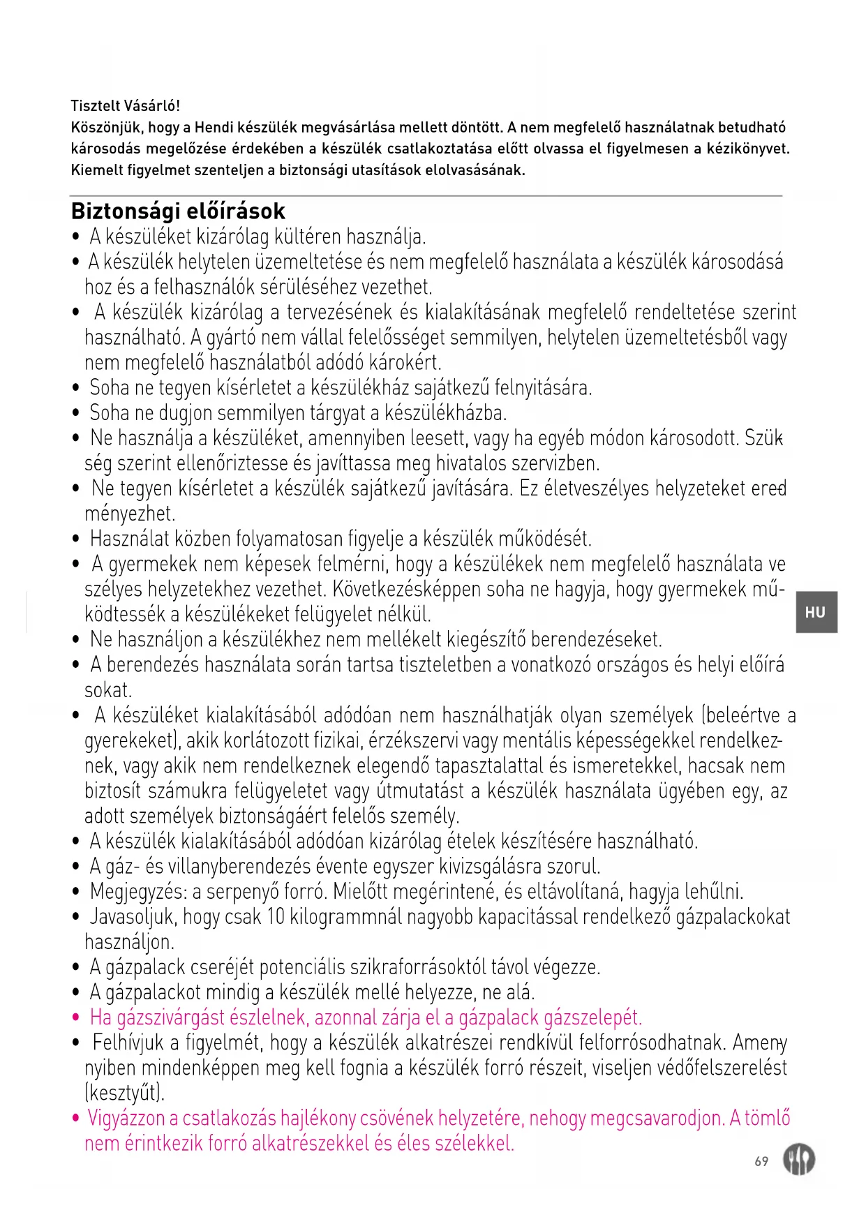 Tisztelt Vásárló! Köszönjük, hogy a Hendi készülék megvásárlása mellett döntött. A nem megfelelő használatnak betudható károsodás megelőzése érdekében a készülék csatlakoztatása előtt olvassa el figyelmesen a kézikönyvet. Kiemelt figyelmet szenteljen a biztonsági utasítások elolvasásának. Biztonsági előírások