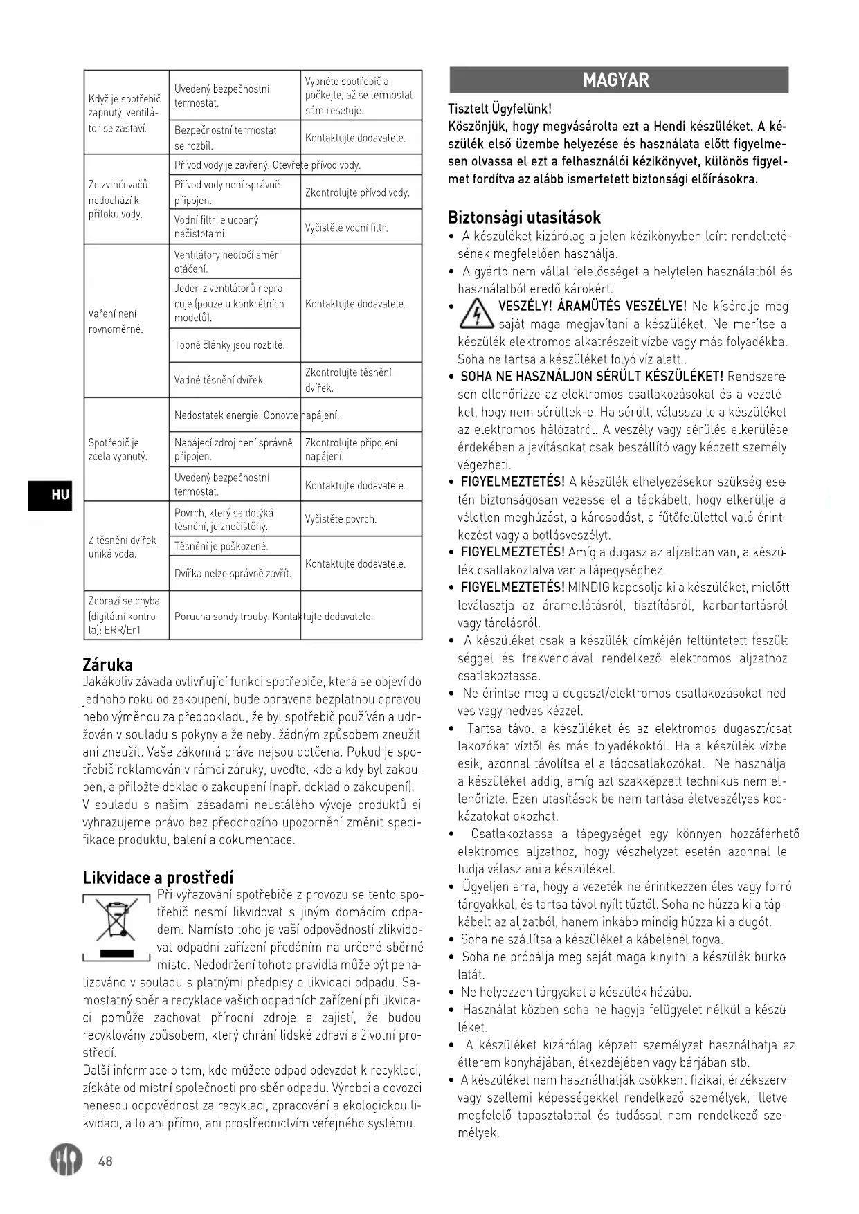 kvidaci, a to ani přímo, ani prostřednictvím veřejného systému. MAGYAR Tisztelt Ügyfelünk! Köszönjük, hogy megvásárolta ezt a Hendi készüléket. A ké