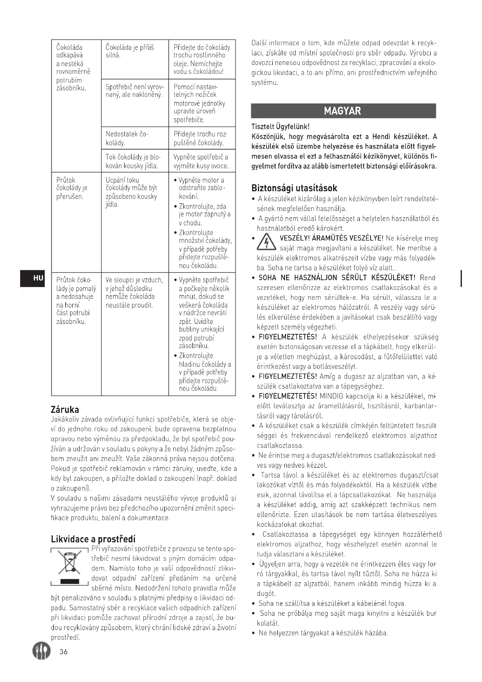tott csokoládét. Jótállás A készülék működését befolyásoló minden olyan hiba, amely a vásárlást követő egy éven belül válik nyilvánvalóvá, javításra vagy cserére szorul, feltéve, hogy a készüléket az utasítások