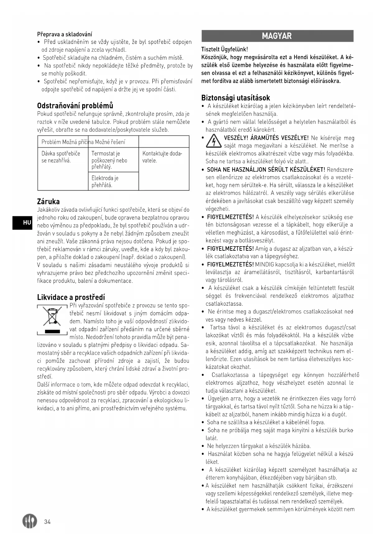 kvidaci, a to ani přímo, ani prostřednictvím veřejného systému. MAGYAR Tisztelt Ügyfelünk! Köszönjük, hogy megvásárolta ezt a Hendi készüléket. A ké