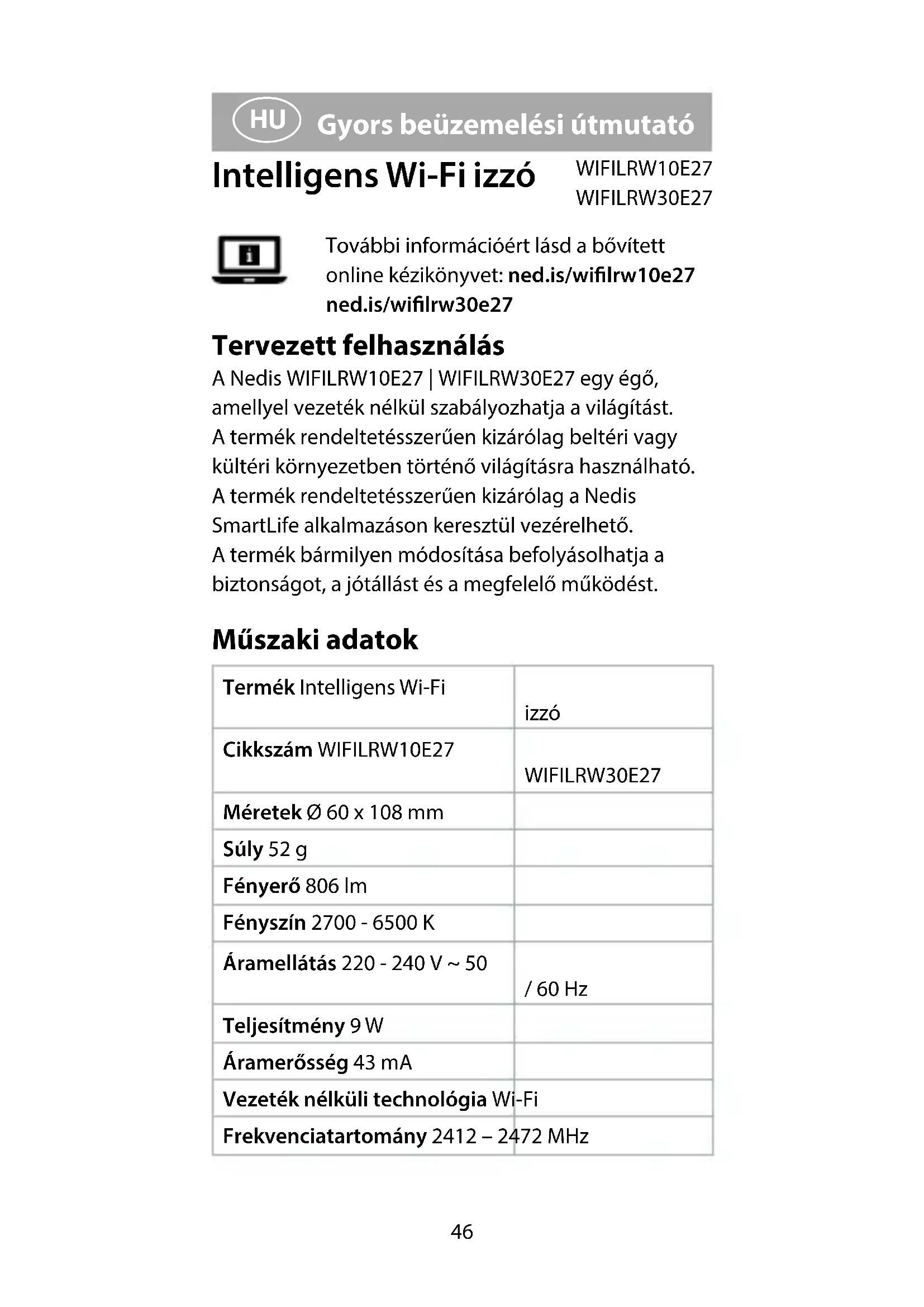Gyors beüzemelési útmutató Intelligens Wi-Fi izzó WIFILRW10E27 WIFILRW30E27 További információért lásd a bővített online kézikönyvet: ned.is/wilrw10e27 ned.is/wilrw30e27 Tervezett felhasználás A Nedis WIFILRW10E27 | WIFILRW30E27 egy égő, amellyel vezeték nélkül szabályozhatja a világítást. A termék rendeltetésszerűen kizárólag beltéri vagy kültéri környezetben történő világításra használható. A termék rendeltetésszerűen kizárólag a Nedis SmartLife alkalmazáson keresztül vezérelhető. A termék bármilyen módosítása befolyásolhatja a biztonságot, a jótállást és a megfelelő működést. Műszaki adatok Termék Intelligens Wi-Fi izzó Cikkszám WIFILRW10E27 WIFILRW30E27 Méretek Ø 60 x 108 mm Súly 52 g Fényerő 806 lm Fényszín 2700 - 6500 K Áramellátás 220 - 240 V ~ 50 / 60 Hz Teljesítmény 9 W Áramerősség 43 mA Vezeték nélküli technológia Wi-Fi Frekvenciatartomány 2412 – 2472 MHz47 Max. rádió-jelátviteli teljesítmény 16 dBm Szerelvény E27 Anyag Műanyag Fő alkatrészek (A kép) 1 izzó 2 elektromos érintkező Biztonsági utasítások