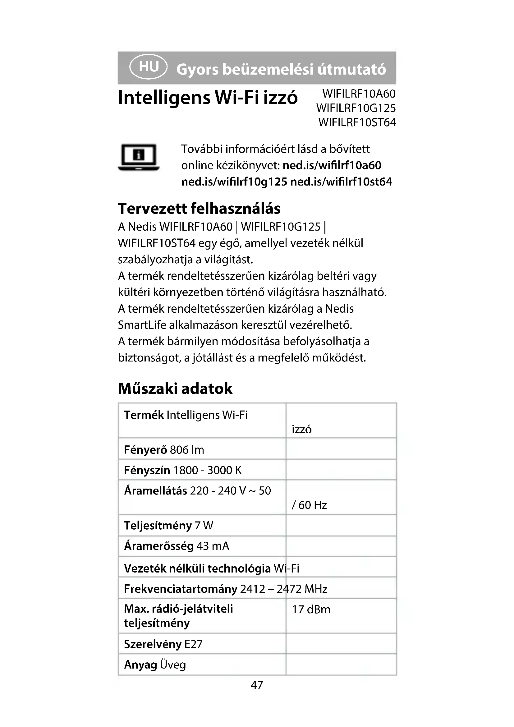 Gyors beüzemelési útmutató Intelligens Wi-Fi izzó WIFILRF10A60 WIFILRF10G125 WIFILRF10ST64 További információért lásd a bővített online kézikönyvet: ned.is/wilrf10a60 ned.is/wilrf10g125 ned.is/wilrf10st64 Tervezett felhasználás A Nedis WIFILRF10A60 | WIFILRF10G125 | WIFILRF10ST64 egy égő, amellyel vezeték nélkül szabályozhatja a világítást. A termék rendeltetésszerűen kizárólag beltéri vagy kültéri környezetben történő világításra használható. A termék rendeltetésszerűen kizárólag a Nedis SmartLife alkalmazáson keresztül vezérelhető. A termék bármilyen módosítása befolyásolhatja a biztonságot, a jótállást és a megfelelő működést. Műszaki adatok Termék Intelligens Wi-Fi izzó Fényerő 806 lm Fényszín 1800 - 3000 K Áramellátás 220 - 240 V ~ 50 / 60 Hz Teljesítmény 7 W Áramerősség 43 mA Vezeték nélküli technológia Wi-Fi Frekvenciatartomány 2412 – 2472 MHz Max. rádió-jelátviteli teljesítmény 17 dBm Szerelvény E27 Anyag Üveg48 Cikkszám Méretek Súly WIFILRF10A60 Ø 60 x 105 mm 30 g WIFILRT10G125 Ø 125 x 172 mm 100 g WIFILRF10ST64 Ø 64 x 142 mm 46 g Fő alkatrészek (A kép) 1 izzó 2 izzószál 3 elektromos érintkező Biztonsági utasítások