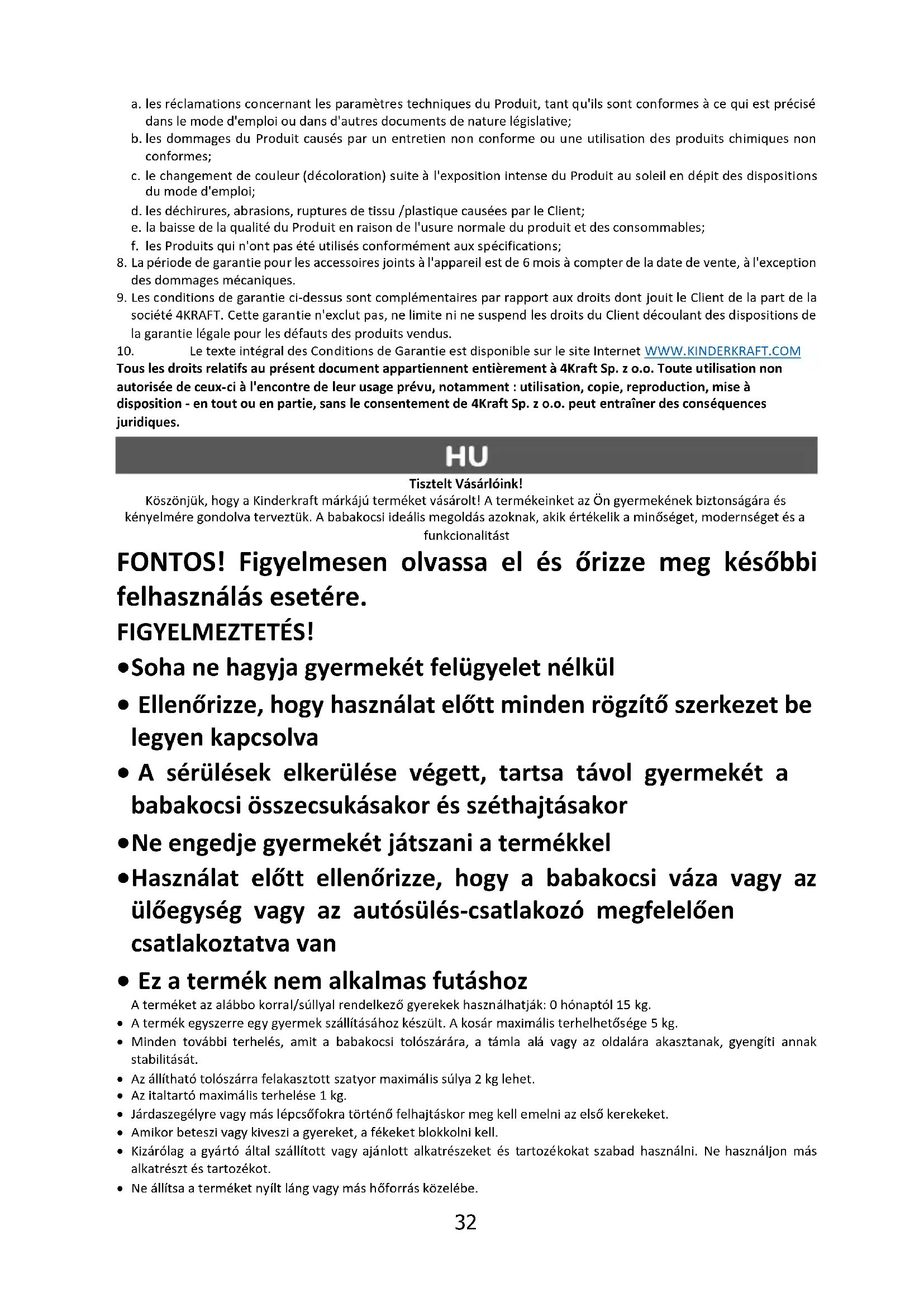 Tous les droits relatifs au présent document appartiennent entièrement à 4Kraft Sp. z o.o. Toute utilisation non autorisée de ceux-ci à l'encontre de leur usage prévu, notamment : utilisation, copie, reproduction, mise à disposition - en tout ou en partie, sans le consentement de 4Kraft Sp. z o.o. peut entraîner des conséquences juridiques. Tisztelt Vásárlóink! Köszönjük, hogy a Kinderkraft márkájú terméket vásárolt! A termékeinket az Ön gyermekének biztonságára és kényelmére gondolva terveztük. A babakocsi ideális megoldás azoknak, akik értékelik a minőséget, modernséget és a funkcionalitást FONTOS! Figyelmesen olvassa el és őrizze meg későbbi felhasználás esetére. FIGYELMEZTETÉS!