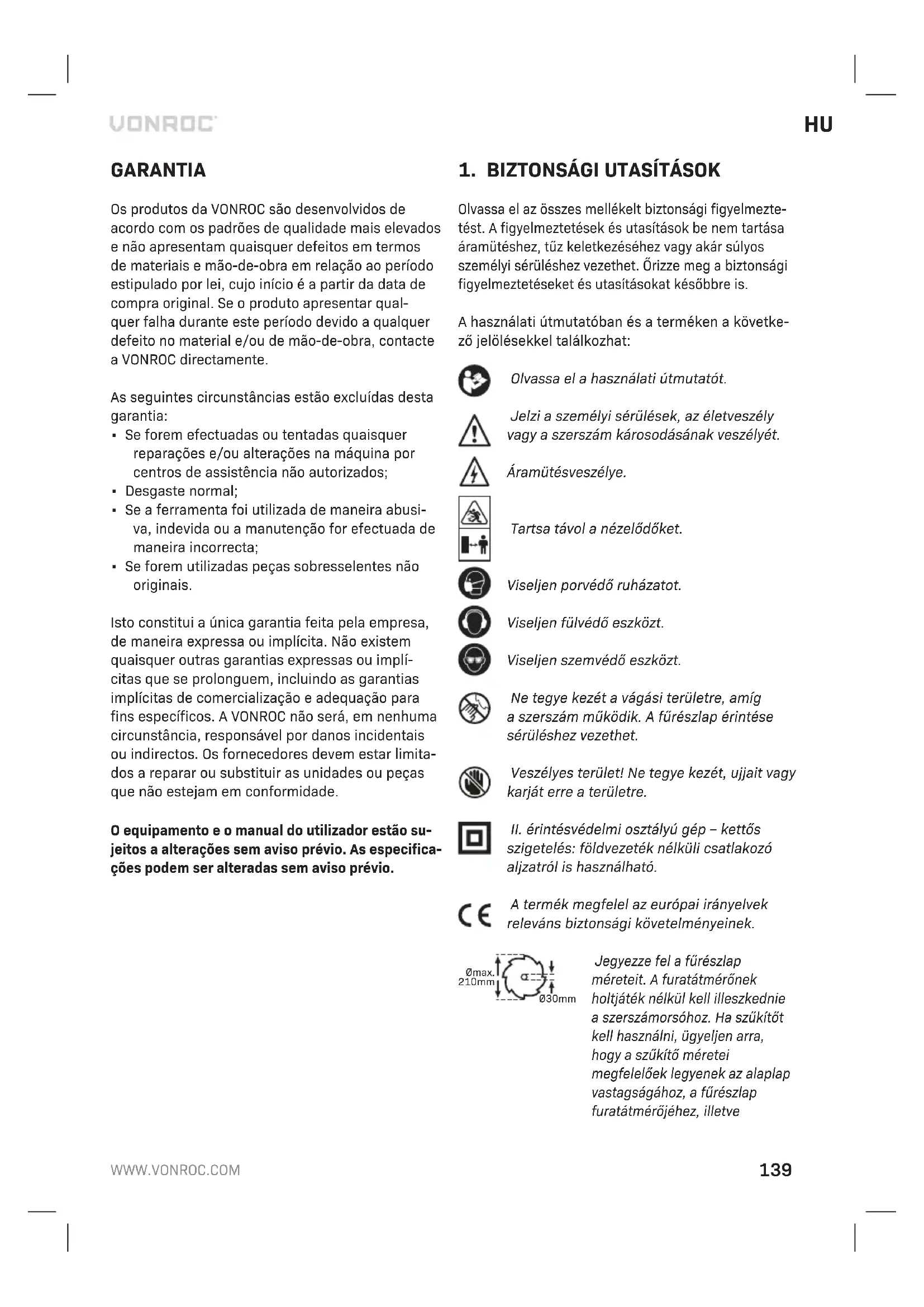 szigetelés: földvezeték nélküli csatlakozó aljzatról is használható. Atermék megfelel az európai irányelvek releváns biztonsági követelményeinek. Ø30mm Ømax. 210mm Jegyezze fel afűrészlap méreteit. Afuratátmérőnek holtjáték nélkül kell illeszkednie aszerszámorsóhoz. Ha szűkítőt kell használni, ügyeljen arra, hogy aszűkítő méretei megfelelőek legyenek az alaplap vastagságához, afűrészlap furatátmérőjéhez, illetve140