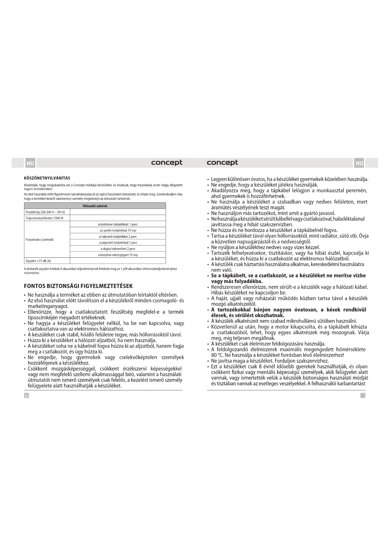 Köszönjük, hogy megvásárolta ezt a Concept márkájú készüléket, és kívánjuk, hogy használata során végig elégedett legyen termékünkkel. Az első használat előtt figyelmesen tanulmányozza át az egész használati útmutatót, és őrizze meg. Gondoskodjon róla, hogy a terméket kezelő valamennyi személy megismerje az útmutató tartalmát. Műszaki adatok Feszültség 220-240 V ~ 50 Hz Teljesítményfelvétel 1500 W Folyamatos üzemidő a botmixer toldalékkal: 1 perc az aprító toldalékkal 10 mp a habverő toldalékkal 2 perc a pépesítő toldalékkal 1 perc a dupla habverővel 2 perc a konyhai robotgéppel 15 mp Zajszint ≤75 dB (A) A deklarált zajszint értékek A akusztikai teljesítménynek felelnek meg az 1 pW akusztikai referenciateljesítményhez viszonyítva.