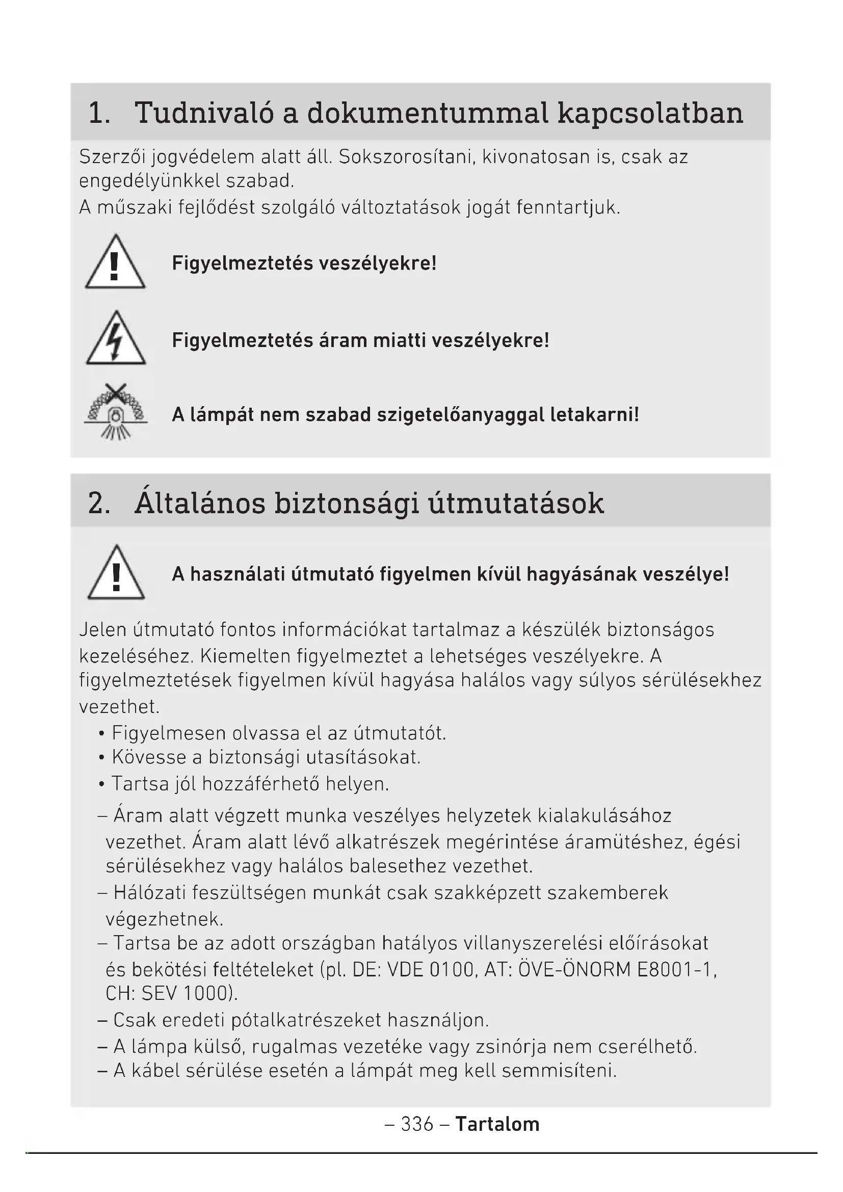 - Tartsa jól hozzáférhető helyen. – Áram alatt végzett munka veszélyes helyzetek kialakulásához vezethet. Áram alatt lévő alkatrészek megérintése áramütéshez, égési sérülésekhez vagy halálos balesethez vezethet. – Hálózati feszültségen munkát csak szakképzett szakemberek végezhetnek. – Tartsa be az adott országban hatályos villanyszerelési előírásokat és bekötési feltételeket (pl. DE: VDE0100, AT:ÖVE-ÖNORM E8001-1, CH:SEV1000). – Csak eredeti pótalkatrészeket használjon. – A lámpa külső, rugalmas vezetéke vagy zsinórja nem cserélhető. – A kábel sérülése esetén a lámpát meg kell semmisíteni.– 337 – Tartalom