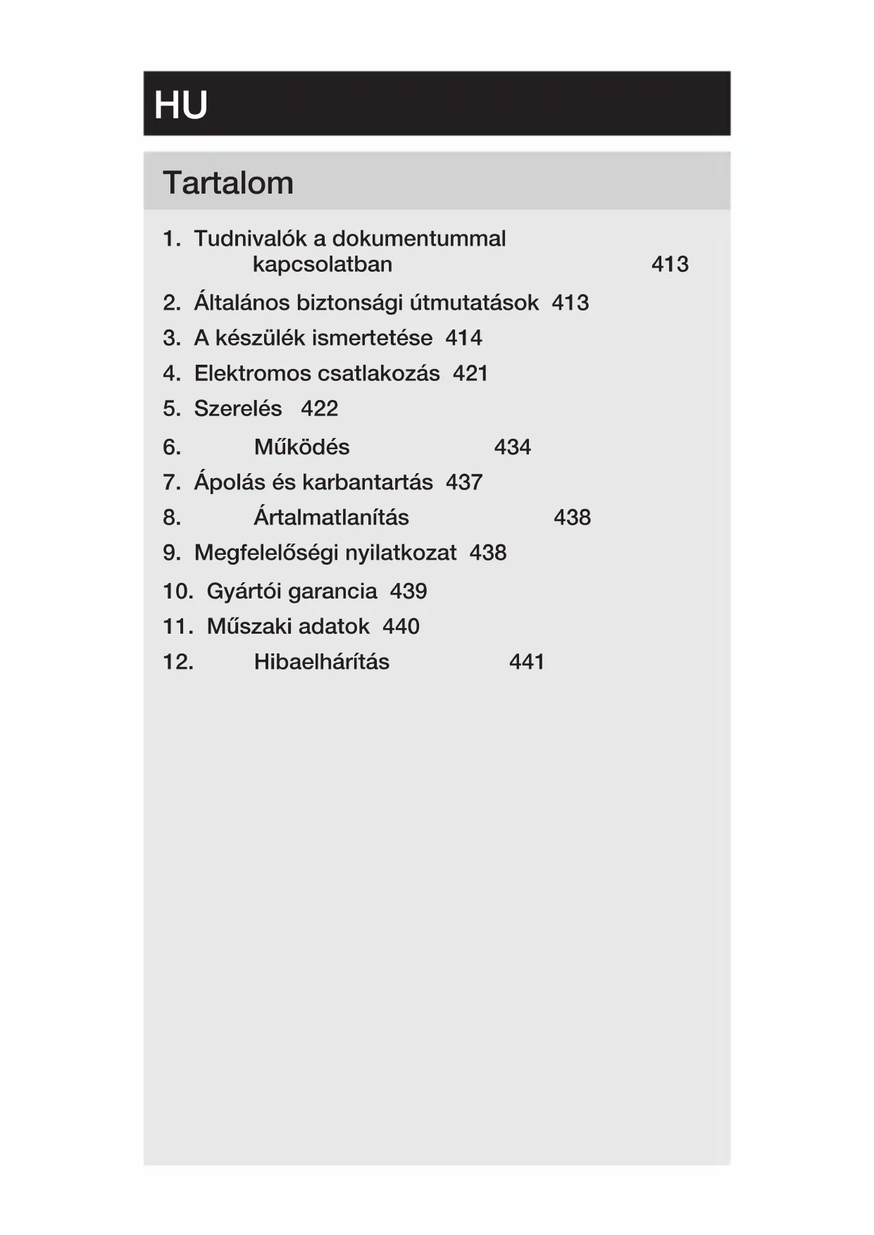 - Minden alkatrészt ellenőrizzen sérülés szempontjából. Sérülések esetén ne vegye használatba a terméket.HU – 423 – Tartalom