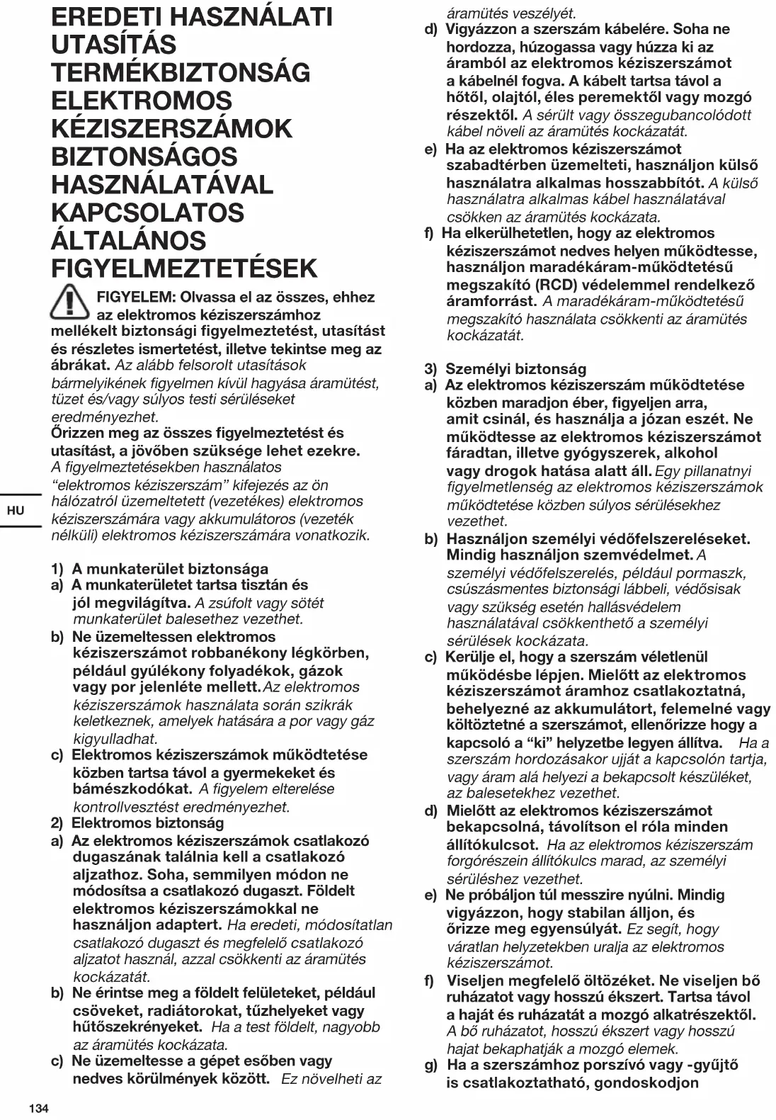 KAPCSOLATOS ÁLTALÁNOS FIGYELMEZTETÉSEK FIGYELEM: Olvassa el az összes, ehhez az elektromos kéziszerszámhoz mellékelt biztonsági figyelmeztetést, utasítást és részletes ismertetést, illetve tekintse meg az ábrákat. Az alább felsorolt utasítások bármelyikének gyelmen kívül hagyása áramütést, tüzet és/vagy súlyos testi sérüléseket eredményezhet. Őrizzen meg az összes figyelmeztetést és utasítást, a jövőben szüksége lehet ezekre. A gyelmeztetésekben használatos “elektromos kéziszerszám” kifejezés az ön hálózatról üzemeltetett (vezetékes) elektromos kéziszerszámára vagy akkumulátoros (vezeték nélküli) elektromos kéziszerszámára vonatkozik.