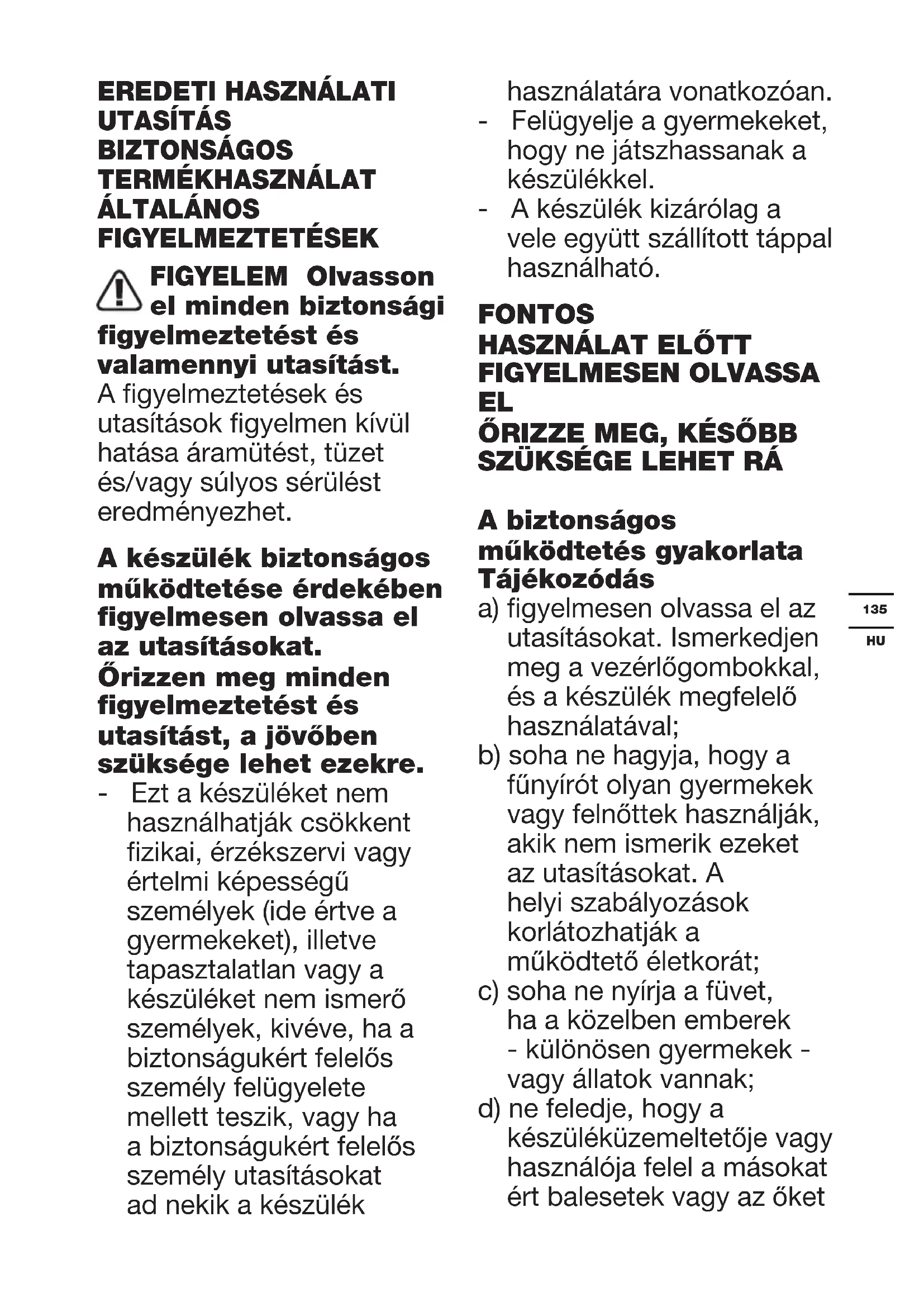A biztonságos működtetés gyakorlata Tájékozódás a) gyelmesen olvassa el az utasításokat. Ismerkedjen meg a vezérlőgombokkal, és a készülék megfelelő használatával; b) soha ne hagyja, hogy a fűnyírót olyan gyermekek vagy felnőttek használják, akik nem ismerik ezeket az utasításokat. A helyi szabályozások korlátozhatják a működtető életkorát; c) soha ne nyírja a füvet, ha a közelben emberek - különösen gyermekek - vagy állatok vannak; d) ne feledje, hogy a készüléküzemeltetője vagy használója felel a másokat ért balesetek vagy az őket136