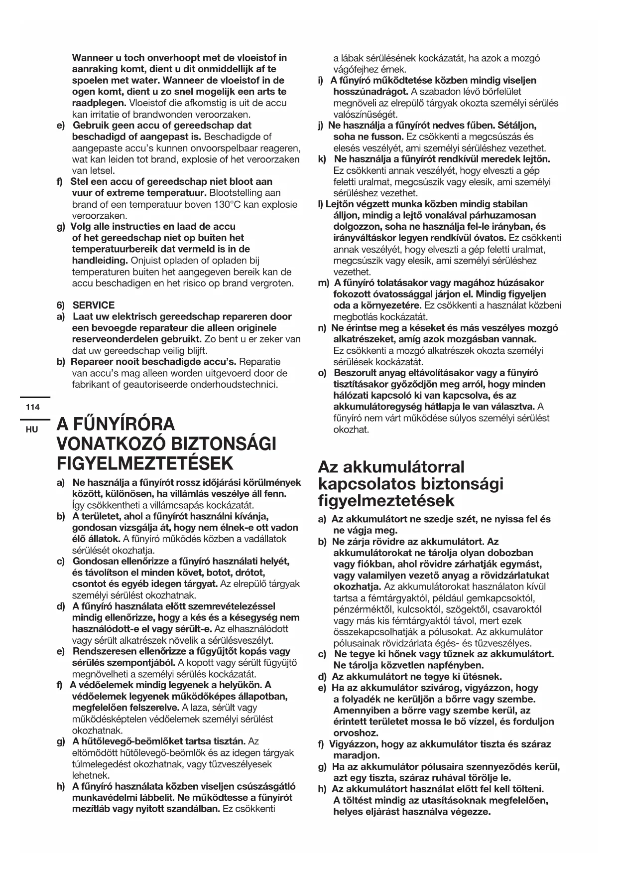 hosszúnadrágot. A szabadon lévő bőrfelület megnöveli az elrepülő tárgyak okozta személyi sérülés valószínűségét. j) Ne használja a fűnyírót nedves fűben. Sétáljon, soha ne fusson. Ez csökkenti a megcsúszás és elesés veszélyét, ami személyi sérüléshez vezethet. k) Ne használja a fűnyírót rendkívül meredek lejtőn. Ez csökkenti annak veszélyét, hogy elveszti a gép feletti uralmat, megcsúszik vagy elesik, ami személyi sérüléshez vezethet. l) Lejtőn végzett munka közben mindig stabilan álljon, mindig a lejtő vonalával párhuzamosan dolgozzon, soha ne használja fel-le irányban, és irányváltáskor legyen rendkívül óvatos. Ez csökkenti annak veszélyét, hogy elveszti a gép feletti uralmat, megcsúszik vagy elesik, ami személyi sérüléshez vezethet. m) A fűnyíró tolatásakor vagy magához húzásakor fokozott óvatossággal járjon el. Mindig figyeljen oda a környezetére. Ez csökkenti a használat közbeni megbotlás kockázatát. n) Ne érintse meg a késeket és más veszélyes mozgó alkatrészeket, amíg azok mozgásban vannak. Ez csökkenti a mozgó alkatrészek okozta személyi sérülések kockázatát. o) Beszorult anyag eltávolításakor vagy a fűnyíró tisztításakor győződjön meg arról, hogy minden hálózati kapcsoló ki van kapcsolva, és az akkumulátoregység hátlapja le van választva. A fűnyíró nem várt működése súlyos személyi sérülést okozhat. Az akkumulátorral kapcsolatos biztonsági figyelmeztetések a) Az akkumulátort ne szedje szét, ne nyissa fel és ne vágja meg. b) Ne zárja rövidre az akkumulátort. Az akkumulátorokat ne tárolja olyan dobozban vagy fiókban, ahol rövidre zárhatják egymást, vagy valamilyen vezető anyag a rövidzárlatukat okozhatja. Az akkumulátorokat használaton kívül tartsa a fémtárgyaktól, például gemkapcsoktól, pénzérméktől, kulcsoktól, szögektől, csavaroktól vagy más kis fémtárgyaktól távol, mert ezek összekapcsolhatják a pólusokat. Az akkumulátor pólusainak rövidzárlata égés- és tűzveszélyes. c) Ne tegye ki hőnek vagy tűznek az akkumulátort. Ne tárolja közvetlen napfényben. d) Az akkumulátort ne tegye ki ütésnek. e) Ha az akkumulátor szivárog, vigyázzon, hogy a folyadék ne kerüljön a bőrre vagy szembe. Amennyiben a bőrre vagy szembe kerül, az érintett területet mossa le bő vízzel, és forduljon orvoshoz. f) Vigyázzon, hogy az akkumulátor tiszta és száraz maradjon. g) Ha az akkumulátor pólusaira szennyeződés kerül, azt egy tiszta, száraz ruhával törölje le. h) Az akkumulátort használat előtt fel kell tölteni. A töltést mindig az utasításoknak megfelelően, helyes eljárást használva végezze.115
