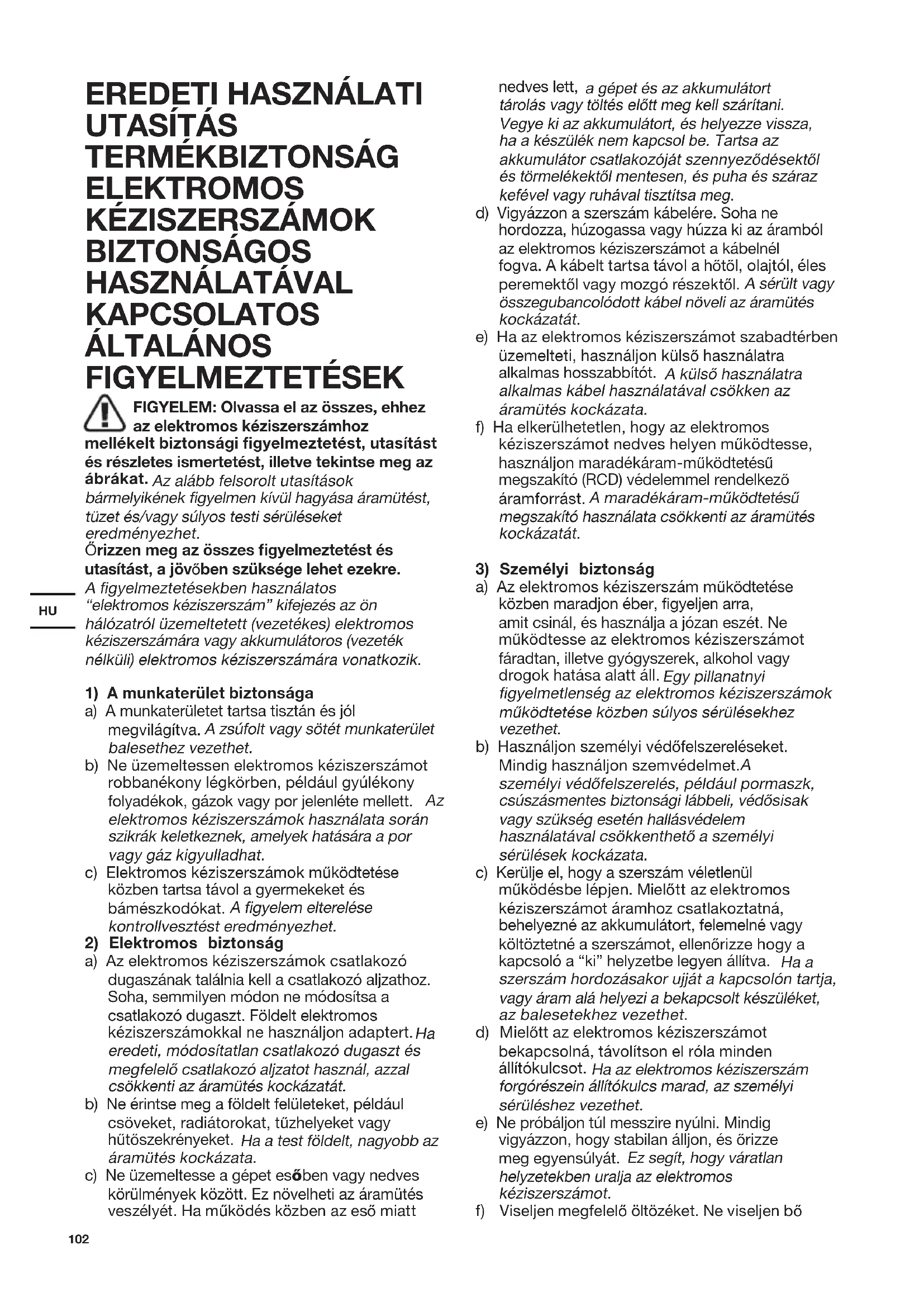 KAPCSOLATOS ÁLTALÁNOS FIGYELMEZTETÉSEK FIGYELEM: Olvassa el az összes, ehhez az elektromos kéziszerszámhoz mellékelt biztonsági figyelmeztetést, utasítást és részletes ismertetést, illetve tekintse meg az ábrákat. Az alább felsorolt utasítások bármelyikének gyelmen kívül hagyása áramütést, tüzet és/vagy súlyos testi sérüléseket eredményezhet. ėrizzen meg az összes figyelmeztetést és utasítást, a jövĘben szüksége lehet ezekre. A gyelmeztetésekben használatos “elektromos kéziszerszám” kifejezés az ön hálózatról üzemeltetett (vezetékes) elektromos kéziszerszámára vagy akkumulátoros (vezeték nélküli) elektromos kéziszerszámára vonatkozik.
