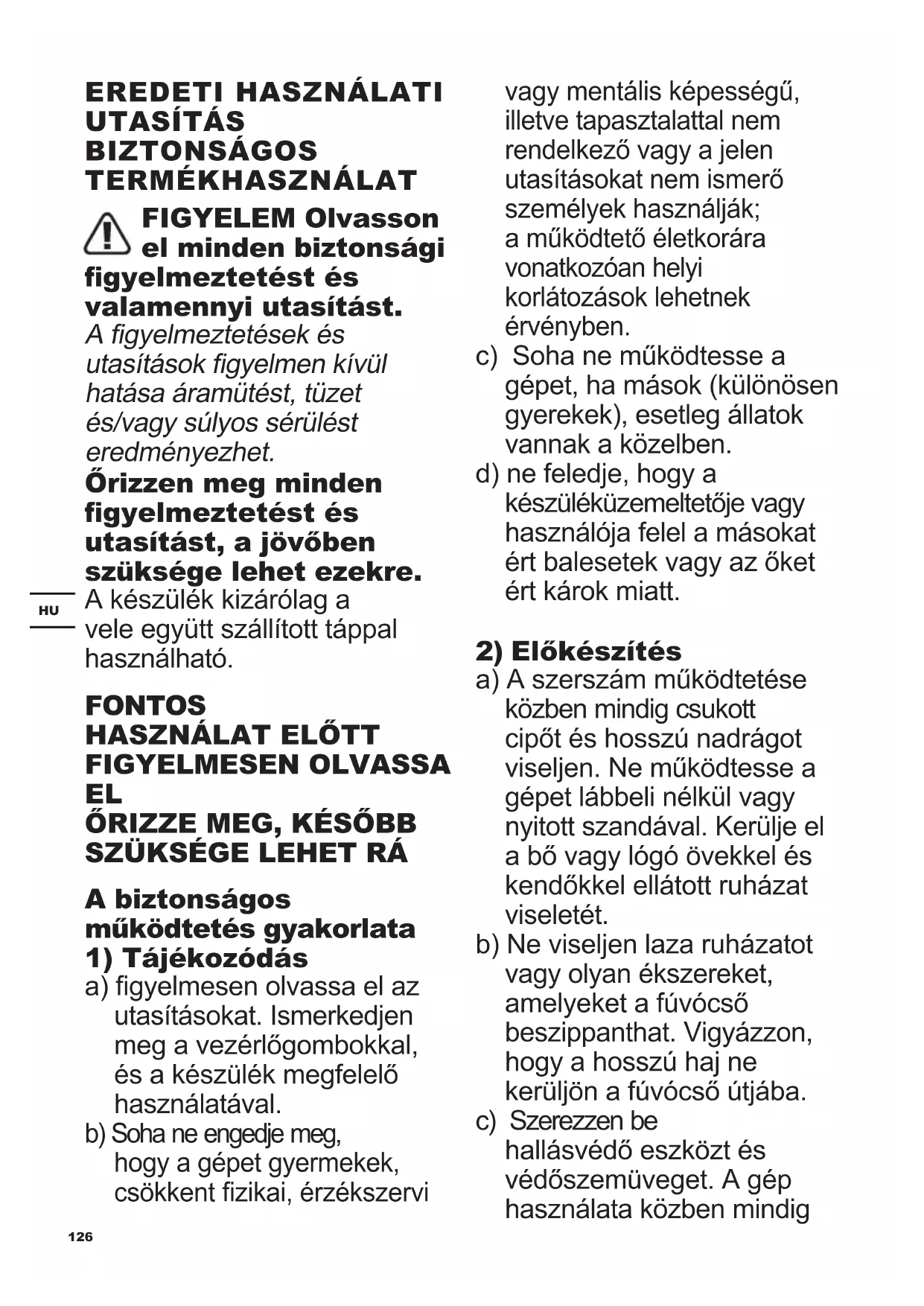 gépet lábbeli nélkül vagy nyitott szandával. Kerülje el DEĘYDJ\OyJy|YHNNHOpV NHQGĘNNHOHOOiWRWWUXKi]DW viseletét. b) Ne viseljen laza ruházatot vagy olyan ékszereket, DPHO\HNHWDI~YyFVĘ beszippanthat. Vigyázzon, hogy a hosszú haj ne NHUOM|QDI~YyFVĘ~WMiED c) Szerezzen be KDOOiVYpGĘHV]N|]WpV YpGĘV]HPYHJHW$JpS használata közben mindigHU