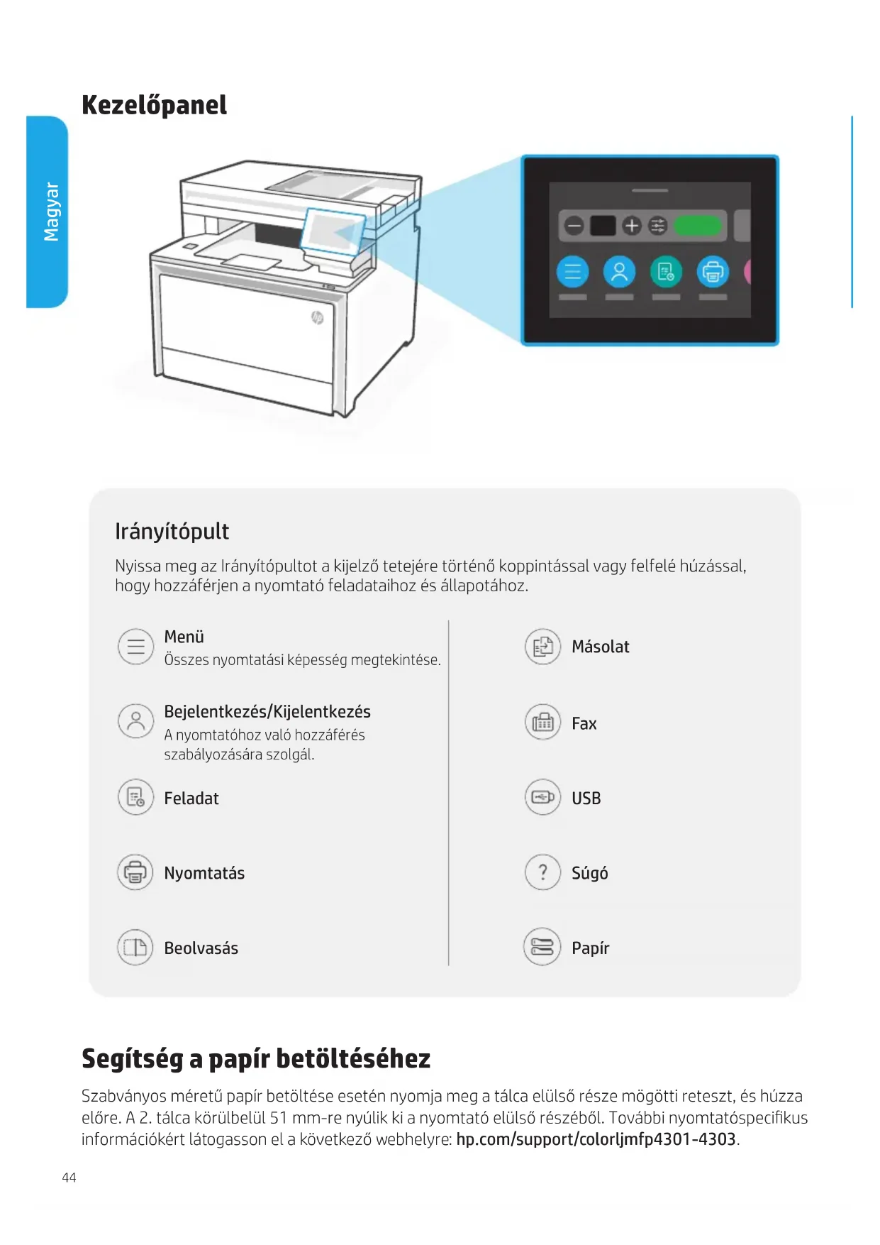 του εκτυπωτή και προσπαθήστε να συνδεθείτε ξανά. https://www.hp.com/support/ colorljmfp4301-4303 Βοήθεια και υποστήριξη Για αντιμετώπιση προβλημάτων και βίντεο για τον εκτυπωτή, επισκεφτείτε την τοποθεσία web υποστήριξης της HP. Οι πληροφορίες που περιέχονται στο παρόν μπορεί να αλλάξουν χωρίς προειδοποίηση.44 Kezelőpanel Segítség a papír betöltéséhez Szabványos méretű papír betöltése esetén nyomja meg a tálca elülső része mögötti reteszt, és húzza előre. A 2. tálca körülbelül 51 mm-re nyúlik ki a nyomtató elülső részéből. További nyomtatóspecikus információkért látogasson el a következő webhelyre: hp.com/support/colorljmfp4301-4303. Irányítópult Nyissa meg az Irányítópultot a kijelző tetejére történő koppintással vagy felfelé húzással, hogy hozzáférjen a nyomtató feladataihoz és állapotához. Menü Összes nyomtatási képesség megtekintése. Bejelentkezés/Kijelentkezés A nyomtatóhoz való hozzáférés szabályozására szolgál. Feladat Nyomtatás Beolvasás Másolat Fax USB Súgó Papír Magyar45