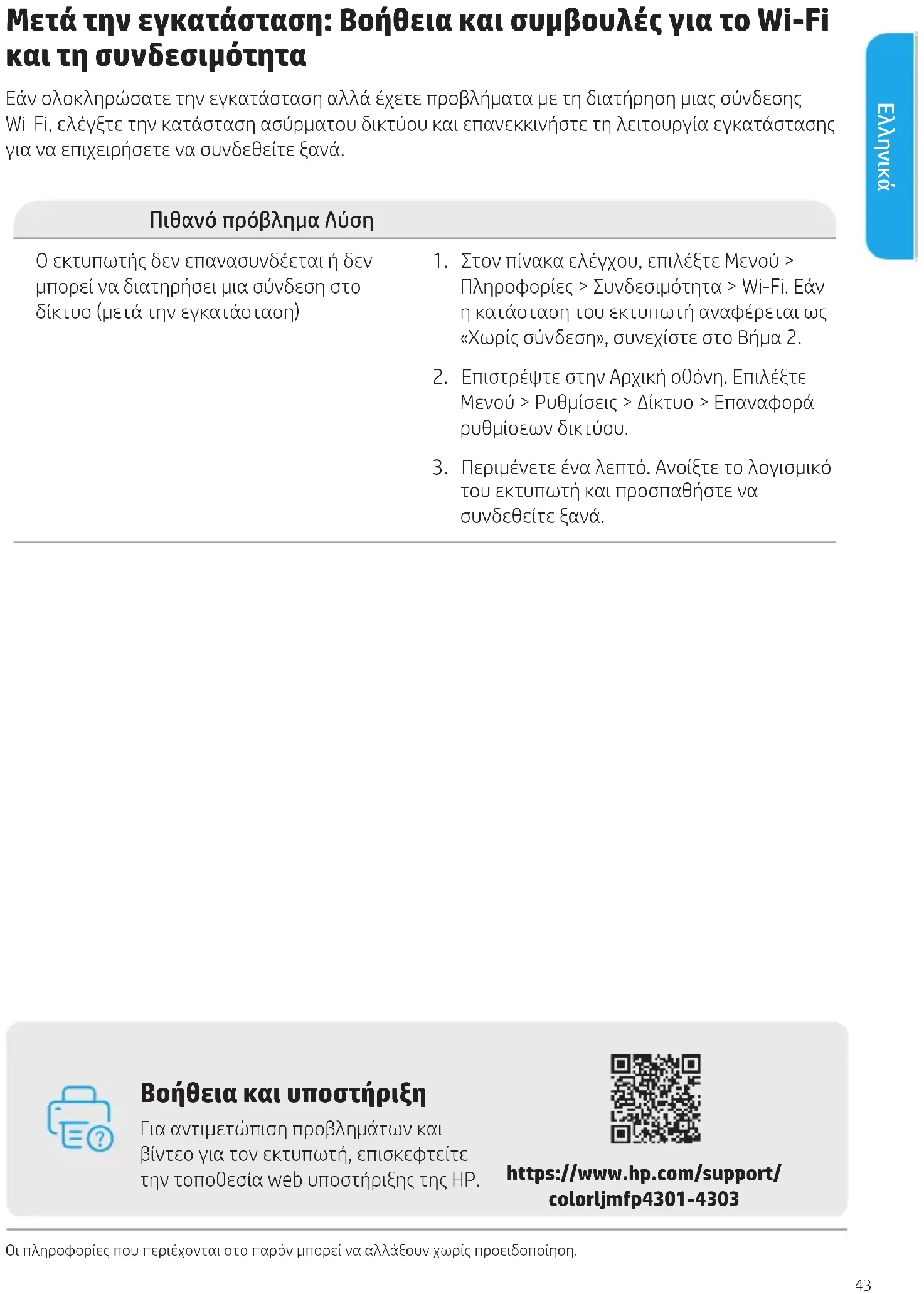 του εκτυπωτή και προσπαθήστε να συνδεθείτε ξανά. https://www.hp.com/support/ colorljmfp4301-4303 Βοήθεια και υποστήριξη Για αντιμετώπιση προβλημάτων και βίντεο για τον εκτυπωτή, επισκεφτείτε την τοποθεσία web υποστήριξης της HP. Οι πληροφορίες που περιέχονται στο παρόν μπορεί να αλλάξουν χωρίς προειδοποίηση.44 Kezelőpanel Segítség a papír betöltéséhez Szabványos méretű papír betöltése esetén nyomja meg a tálca elülső része mögötti reteszt, és húzza előre. A 2. tálca körülbelül 51 mm-re nyúlik ki a nyomtató elülső részéből. További nyomtatóspecikus információkért látogasson el a következő webhelyre: hp.com/support/colorljmfp4301-4303. Irányítópult Nyissa meg az Irányítópultot a kijelző tetejére történő koppintással vagy felfelé húzással, hogy hozzáférjen a nyomtató feladataihoz és állapotához. Menü Összes nyomtatási képesség megtekintése. Bejelentkezés/Kijelentkezés A nyomtatóhoz való hozzáférés szabályozására szolgál. Feladat Nyomtatás Beolvasás Másolat Fax USB Súgó Papír Magyar45