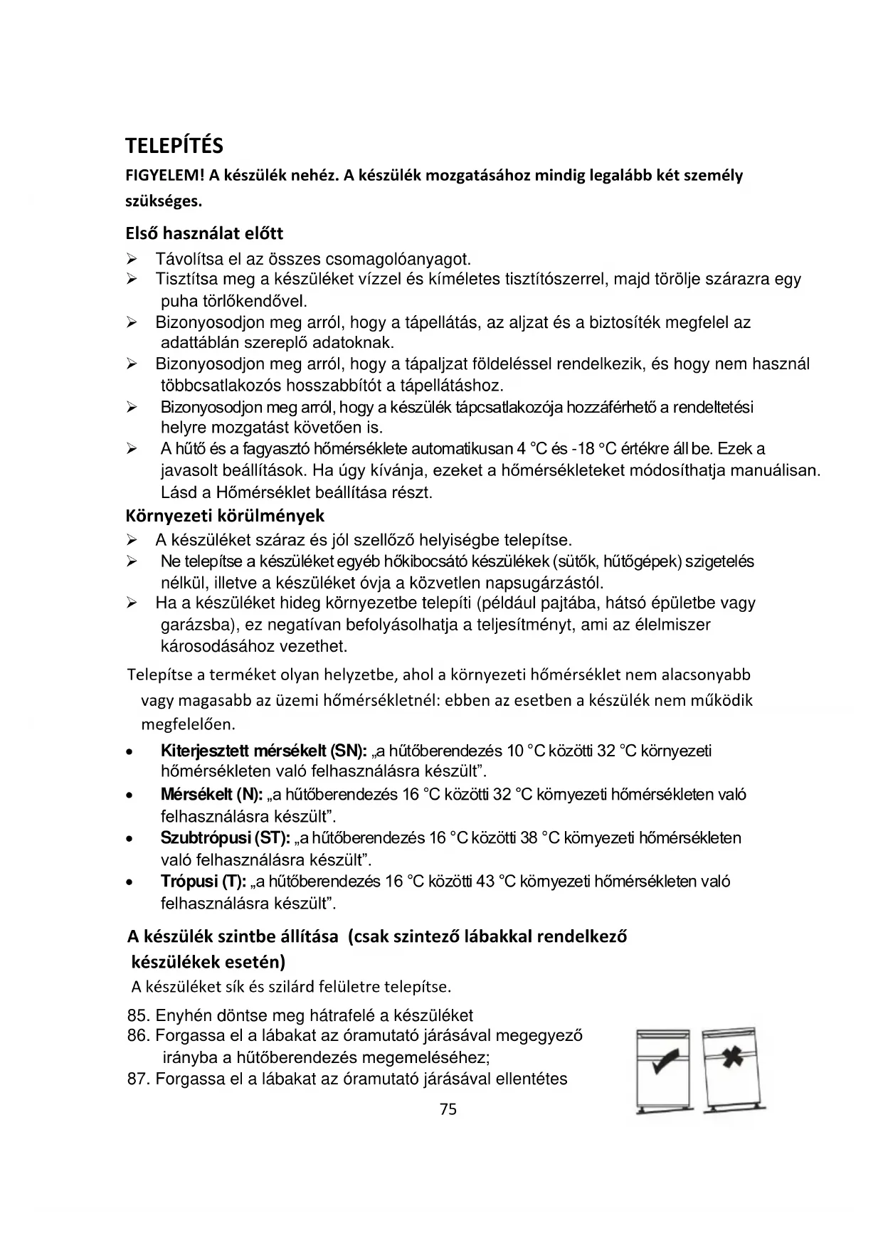 - Trópusi (T): „a hűtőberendezés 16 °C közötti 43 °C környezeti hőmérsékleten való felhasználásra készült”. A készülék szintbe állítása (csak szintező lábakkal rendelkező készülékek esetén) A készüléket sík és szilárd felületre telepítse.
