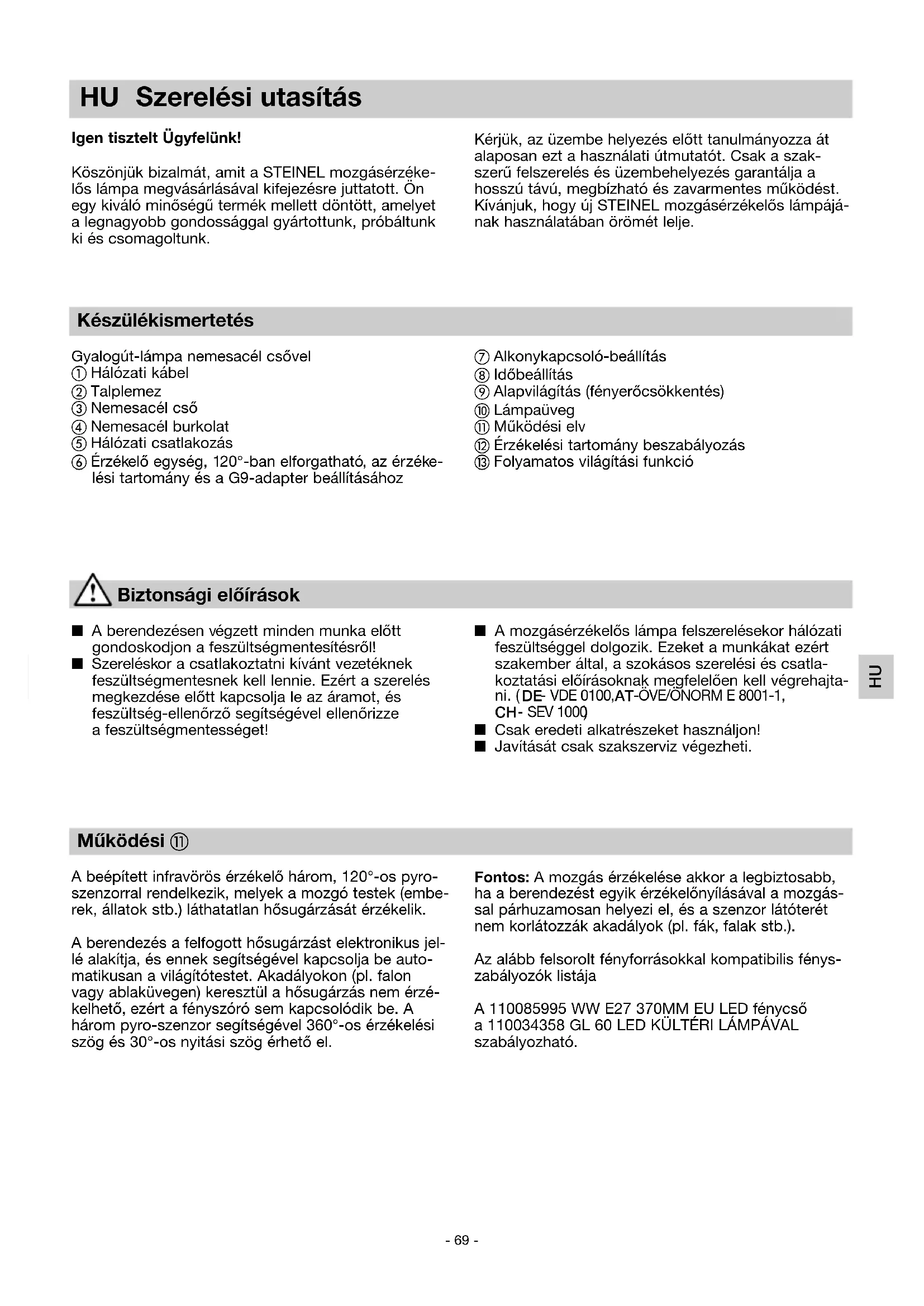 Sadece AB ülkeleri için: Atık Elektrikli ve Elektronik Cihazlar Avrupa yönergesi- ne ve bunun dönüştüğü ulusal yasaya göre, artık kullanılamayacak haldeki elektrikli cihazların ayrı toplanıp çevre dostu geri dönüşüm için gönderilmesi zorunludur. Işık kaynağı son kullanıcı tarafından değiştirilebilir.- 69 - Működési A beépített infravörös érzékelő három, 120°-os pyro- szenzorral rendelkezik, melyek a mozgó testek (embe- rek, állatok stb.) láthatatlan hősugárzását érzékelik. A berendezés a felfogott hősugárzást elektronikus jel- lé alakítja, és ennek segítségével kapcsolja be auto- matikusan a világítótestet. Akadályokon (pl. falon vagy ablaküvegen) keresztül a hősugárzás nem érzé- kelhető, ezért a fényszóró sem kapcsolódik be. A három pyro-szenzor segítségével 360°-os érzékelési szög és 30°-os nyitási szög érhető el. Készülékismertetés Gyalogút-lámpa nemesacél csővel Hálózati kábel Talplemez Nemesacél cső Nemesacél burkolat Hálózati csatlakozás Érzékelő egység, 120°-ban elforgatható, az érzéke- lési tartomány és a G9-adapter beállításához HU Szerelési utasítás Igen tisztelt Ügyfelünk! Köszönjük bizalmát, amit a STEINEL mozgásérzéke- lős lámpa megvásárlásával kifejezésre juttatott. Ön egy kiváló minőségű termék mellett döntött, amelyet a legnagyobb gondossággal gyártottunk, próbáltunk ki és csomagoltunk. Biztonsági előírások n A berendezésen végzett minden munka előtt gondoskodjon a feszültségmentesítésről! n Szereléskor a csatlakoztatni kívánt vezetéknek feszültségmentesnek kell lennie. Ezért a szerelés megkezdése előtt kapcsolja le az áramot, és feszültség-ellenőrző segítségével ellenőrizze a feszültségmentességet! Kérjük, az üzembe helyezés előtt tanulmányozza át alaposan ezt a használati útmutatót. Csak a szak- szerű felszerelés és üzembehelyezés garantálja a hosszú távú, megbízható és zavarmentes működést. Kívánjuk, hogy új STEINEL mozgásérzékelős lámpájá- nak használatában örömét lelje. n A mozgásérzékelős lámpa felszerelésekor hálózati feszültséggel dolgozik. Ezeket a munkákat ezért szakember által, a szokásos szerelési és csatla- koztatási előírásoknak megfelelően kell végrehajta- ni. (