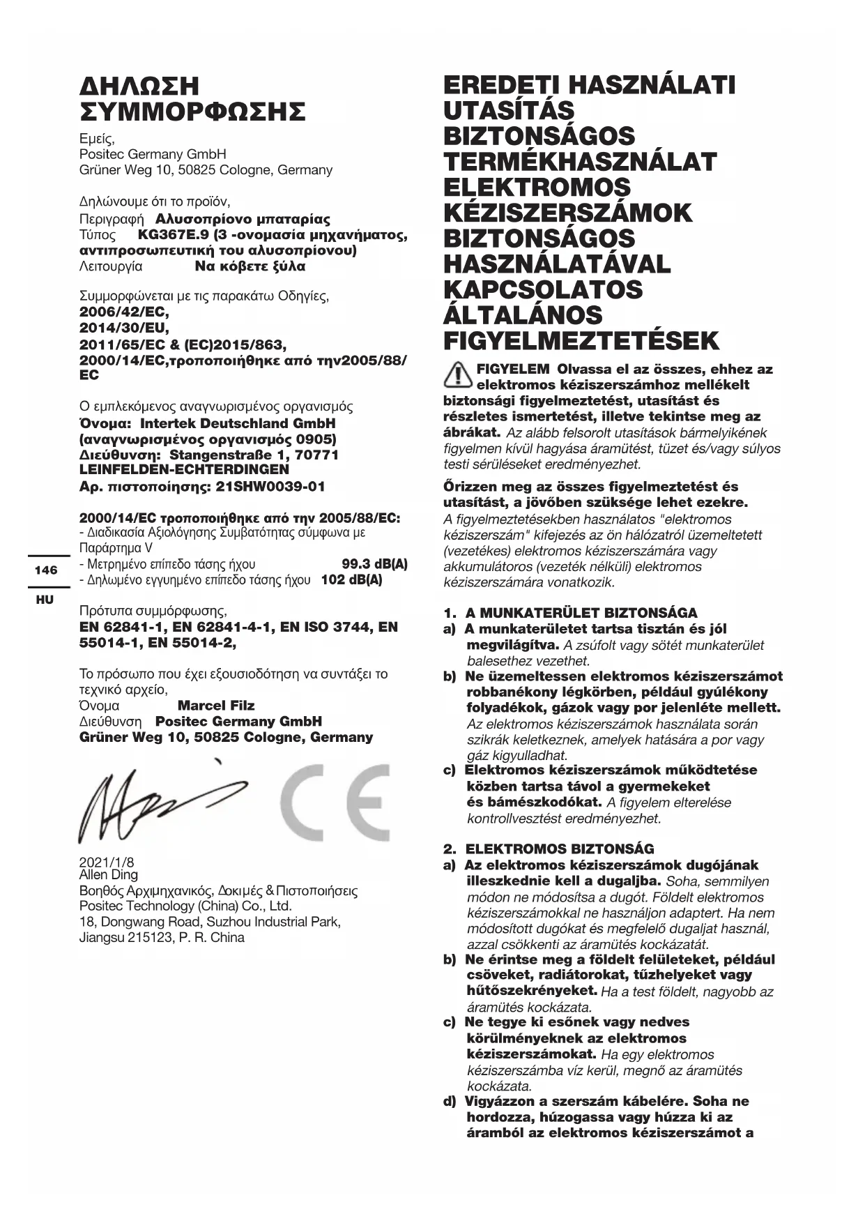 NYILATKOZAT A gyártó: Positec Germany GmbH Grüner Weg 10, 50825 Cologne, Germany Kijelenti, hogy a termék: Leírás Akkus láncfűrész Típus KG367E.9 (3 - a gép, azaz a láncos és rudas fűrész rendeltetése) Rendeltetés Fa vágása Megfelel a következő irányelveknek, 2006/42/EC 2014/30/EU 2011/65/EU&(EU)2015/863 2000/14/EC módosítva: 2005/88/EC Tanúsítási szervezet Név: Intertek Deutschland GmbH (tanúsítási szervezet 0905) Cím: Stangenstraße 1, 70771 LEINFELDEN- ECHTERDINGEN Tanúsítvány száma:: 21SHW0039-01 2000/14/EC módosítva: 2005/88/EC: - Megfelelőség-ellenőrző eljárás a V függelék értelmében - Mért hangerő-szint 99.3 dB(A) - Garantált hangerő-szint 102 dB(A) Az alábbi normáknak: EN 62841-1, EN 62841-4-1, EN ISO 3744, EN 55014-1, EN 55014-2 A műszaki dokumentáció összeállítására jogosult személy, Név: Marcel Filz Cím: Positec Germany GmbH, Grüner Weg 10, 50825 Cologne, Germany 2021/1/8 Allen Ding Helyettes főmérnöke, Tesztelés és minősítés Positec Technology (China) Co., Ltd. 18, Dongwang Road, Suzhou Industrial Park, Jiangsu 215123, P. R. China158