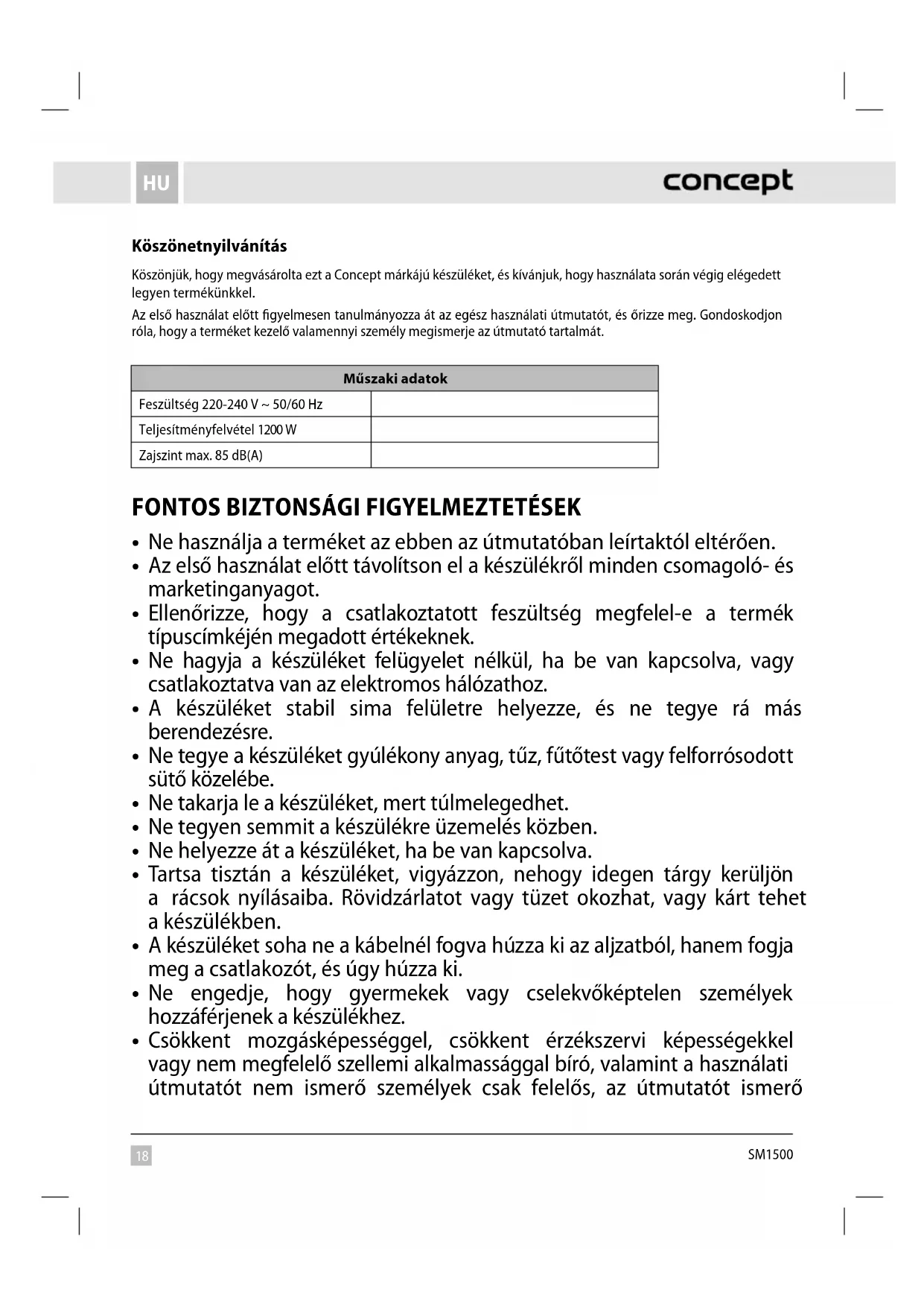 HASZNÁLATI ÚTMUTATÓ SM1500 Concept