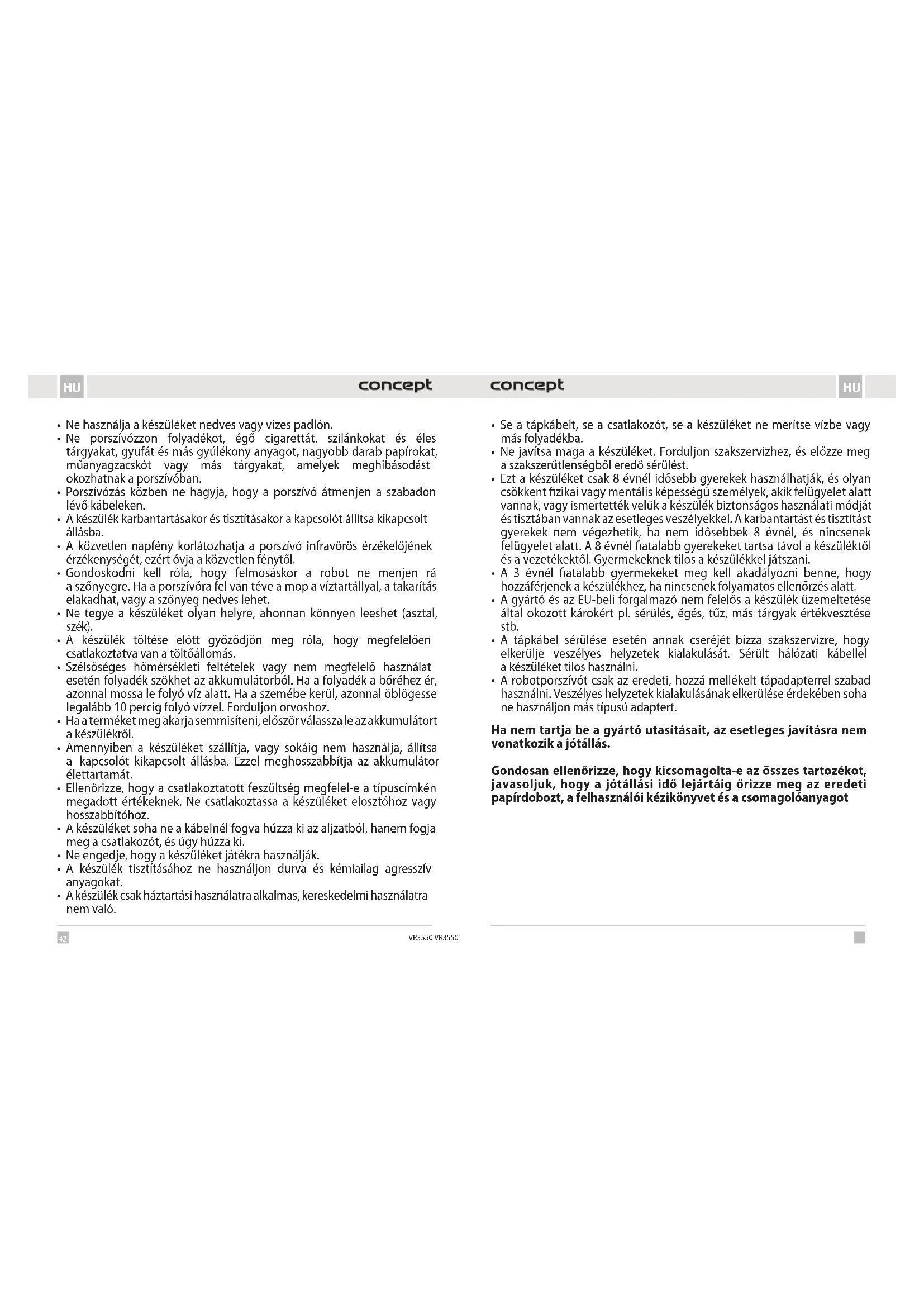 Köszönjük, hogy megvásárolta ezt a Concept márkájú készüléket, és kívánjuk, hogy használata során végig elégedett legyen termékünkkel. Az első használat előtt figyelmesen tanulmányozza át az egész használati útmutatót, és őrizze meg. Gondoskodjon róla, hogy a terméket kezelő valamennyi személy megismerje az útmutató tartalmát. Műszaki adatok Teljesítményfelvétel 65 W Az akkumulátor feszültsége 14,4 V A tápadapter feszültsége AC 100-240 V - 50/60 Hz Zajszint ≤ 68 dB Akkumulátor 5200 mAh, Li-Ion Működési idő 150 perc A teljes feltöltés időtartama 4-5 óra Frekvenciatartomány 2,412 - 2,472 GHz Az adó teljesítménye (max.) 17,11 dBm FONTOS Az elektromos hálózathoz való csatlakoztatás előtt szemrevételezéssel ellenőrizze, hogy az egység nem sérült, és a szállítás során sem károsodott.